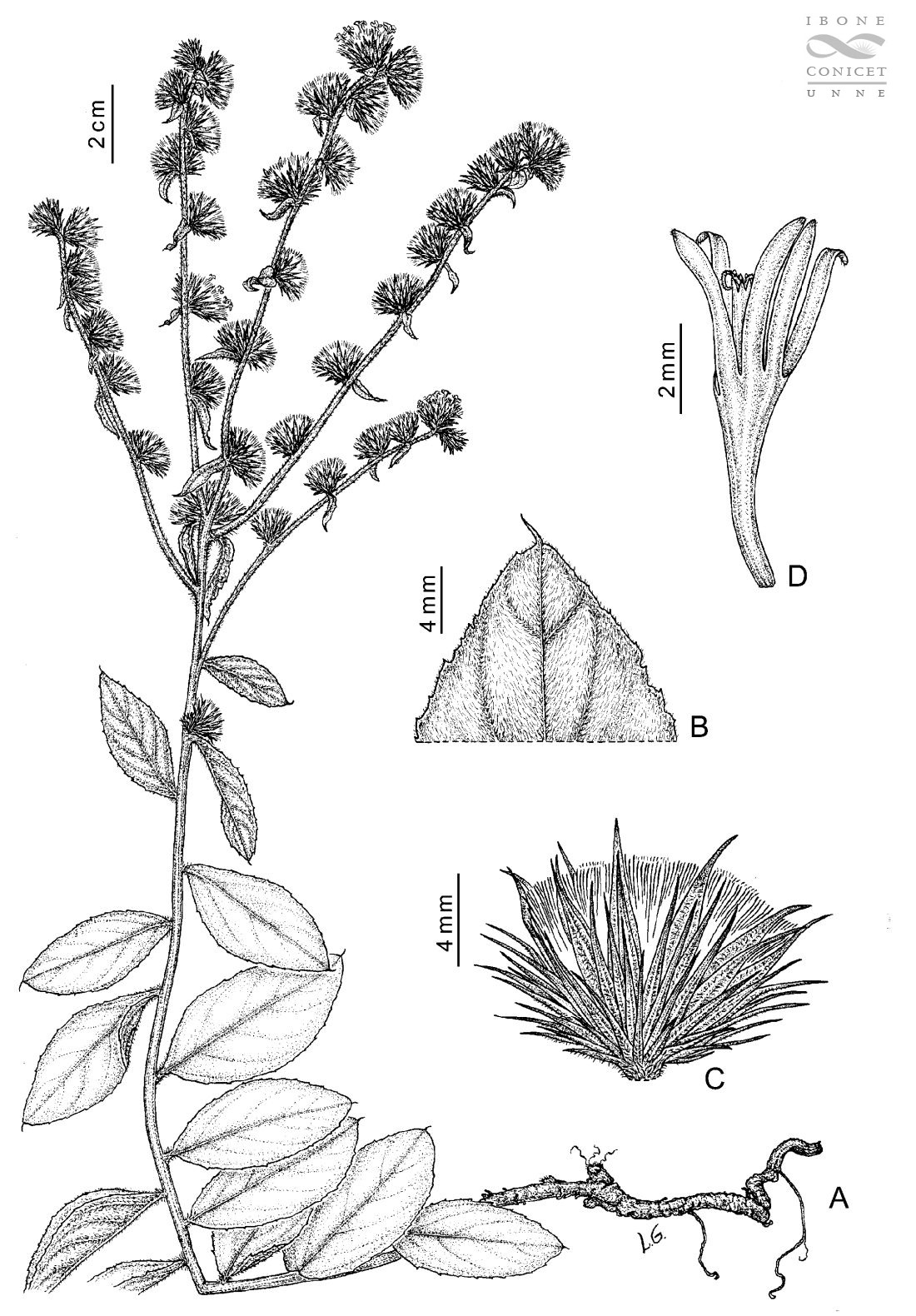 A. Planta. B. Detalle del ápice de la lámina foliar. C. Capítulo. D. Corola con detalle de las anteras y el ápice del estilo.