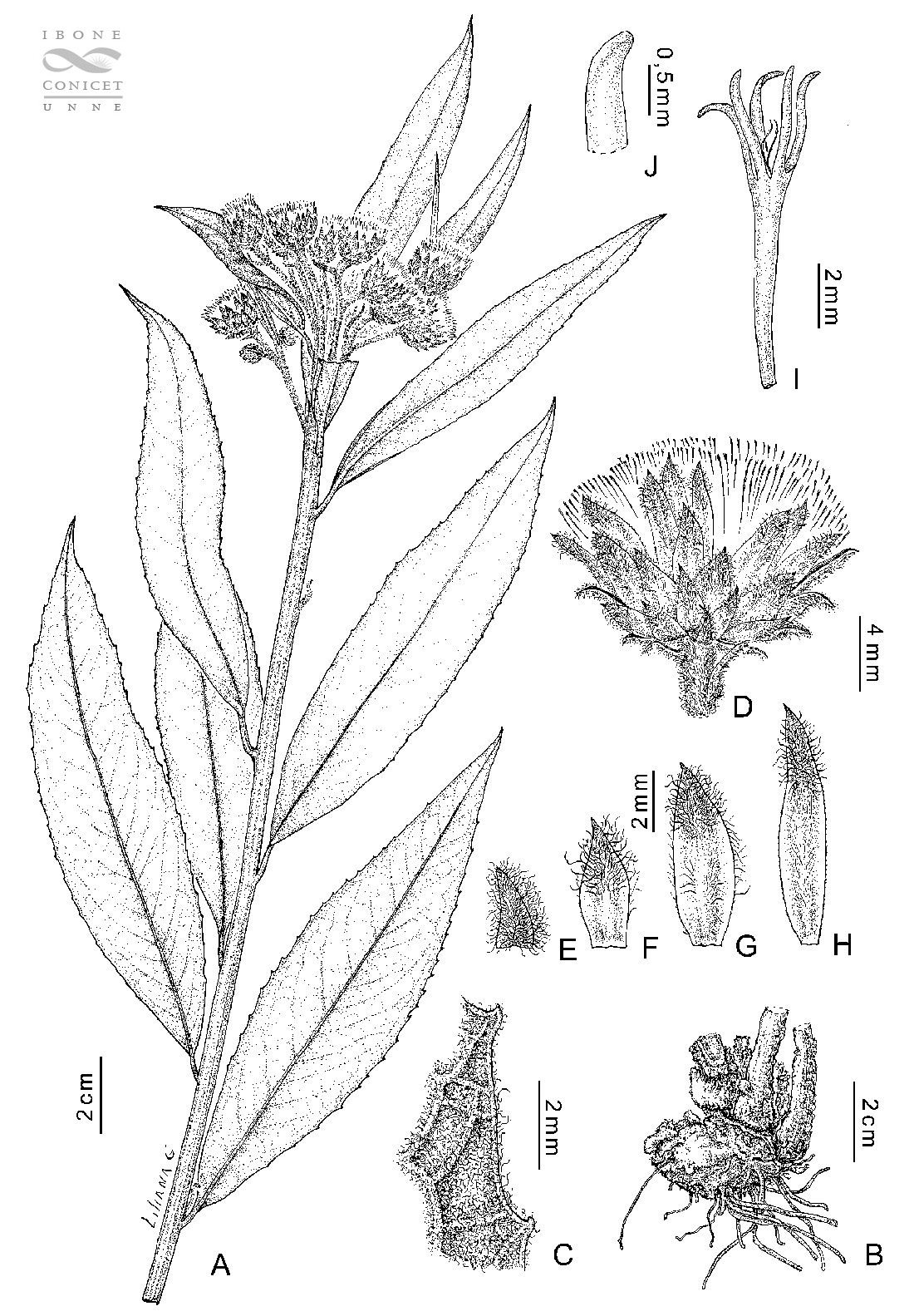 A. Parte superior de la planta. B. Xilopodio. C. Detalle del margen de la hoja. D. Capitulo. E-F. Filarios externos. G. Filario intermedio. H. Filario interno. I. Corola con detalle del ápice del estilo y estambres. J. Ápice del lóbulo de la corola.