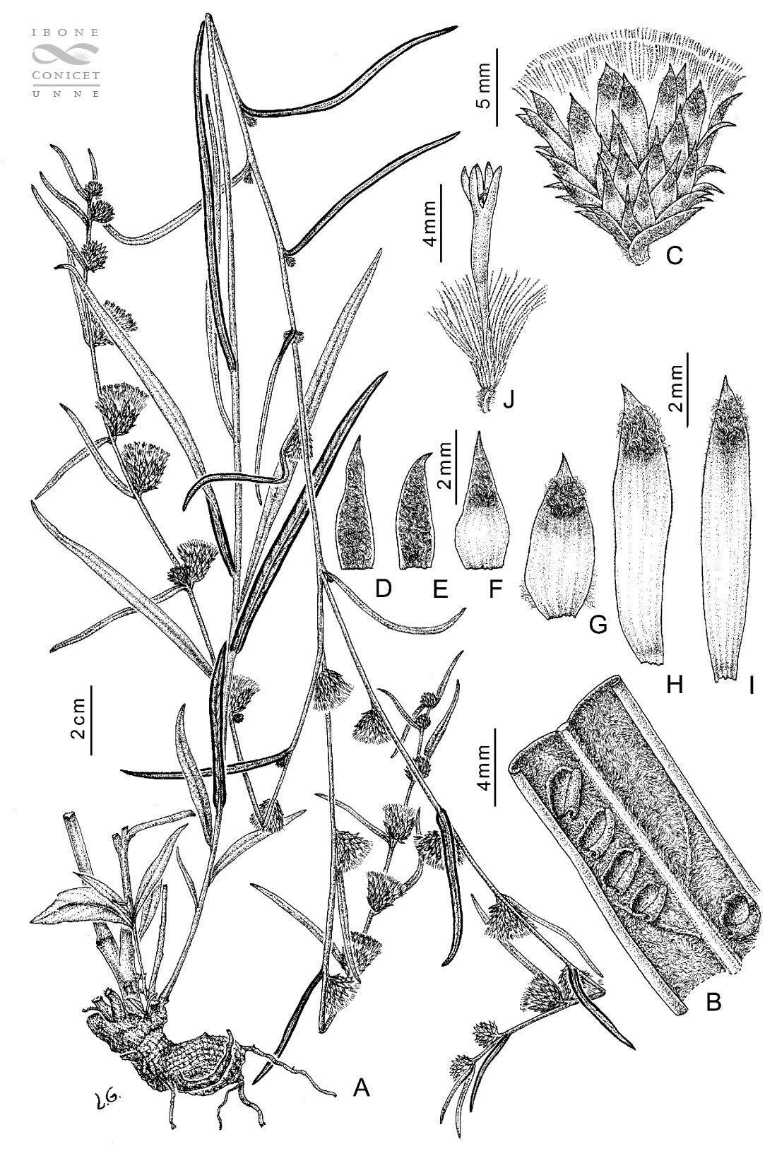 A. Planta. B. Porción de hoja mostrando la capa lanosa del hipofilo parcialmente desprendida. C. Capitulo. D-E. Filarios externos. F-G. Filarios intermedios. H-I. Filarios internos. J. Aquenio inmaduro con el resto de la flor.