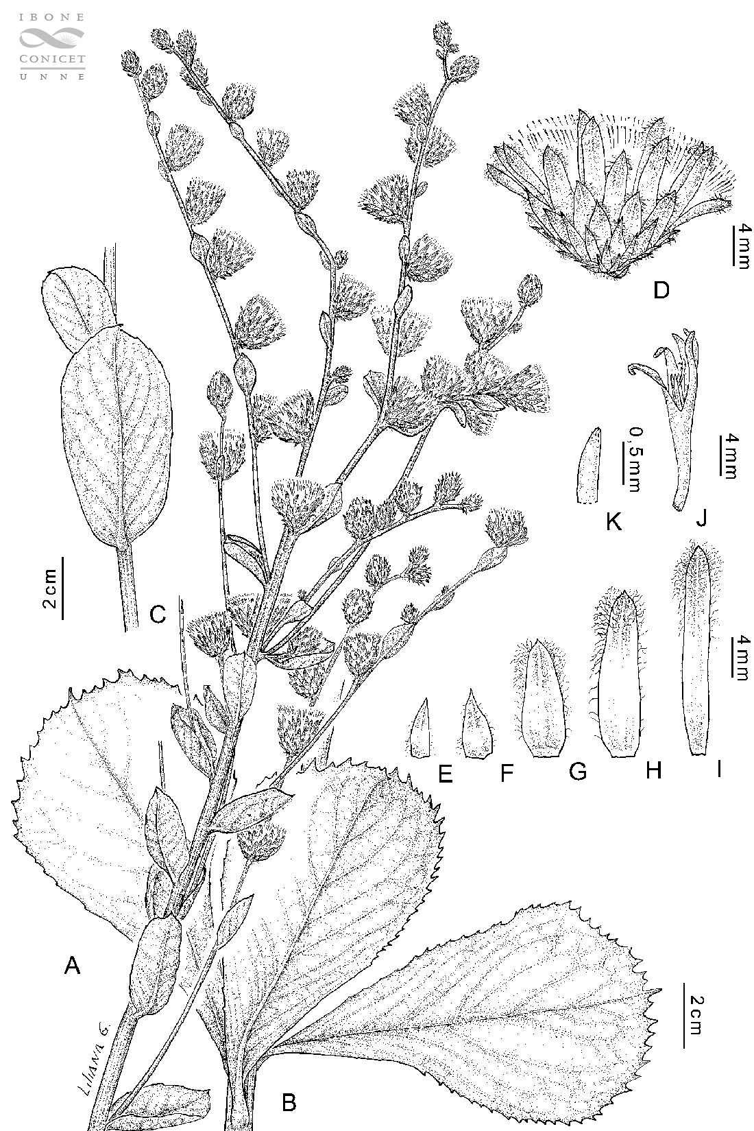 A. Rama florífera. B. Hojas basales. C. Brácteas de la inflorescencia. D. Capitulo. E-F. Filarios externos. G-H. Filarios intermedios. I. Filario interno. J. Corola con detalle del ápice del estilo y estambres. K. Ápice del lóbulo de la corola.
