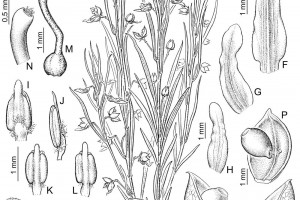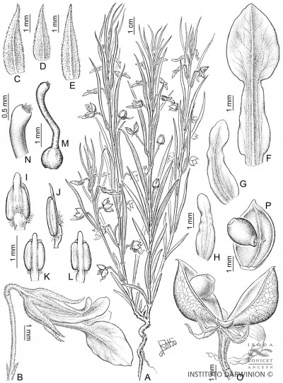Sufrútices de 25-40 cm de alto, con la base leñosa y en general ramificados desde la base. Hojas opuestas; láminas lanceoladas a notablemente lineares, de 4-7 × 0,3-0,6 cm, bastante revolutas, con margen entero, subentero o levemente dentado, en general con apariencia de gramínea por las hojas lineares, característica de la cual proviene su epíteto específico. Flores blancas a rosadas, solitarias, axilares, ca. 10 mm de largo; sépalos subiguales, triangulares a lanceolados, de 2-3 mm de largo; pétalos superiores oblongos a ovados, de 3-4,5 mm de largo; pétalos laterales subfalcados, oblongos, levemente contraídos en la región media, de 6-8,5 mm de largo; labelo con la base angosta y larga, de 4-5,5 mm de largo, y la lámina ovoide, en general más larga que ancha y el extremo de forma triangular, terminando en una punta aguda de 3-6,4 × 2,5-3,5 mm; estambres finamente pubescentes en la base, los 2 inferiores con pequeña verruga sobre el filamento; ovario globoso, glabro; estilo un poco más largo que los estambres, de 2-3 mm de largo, formando una ¨S¨ regular. Cápsulas de 4-8 mm de diámetro. Semillas ovoides, de 1,5-2,5 mm de largo.