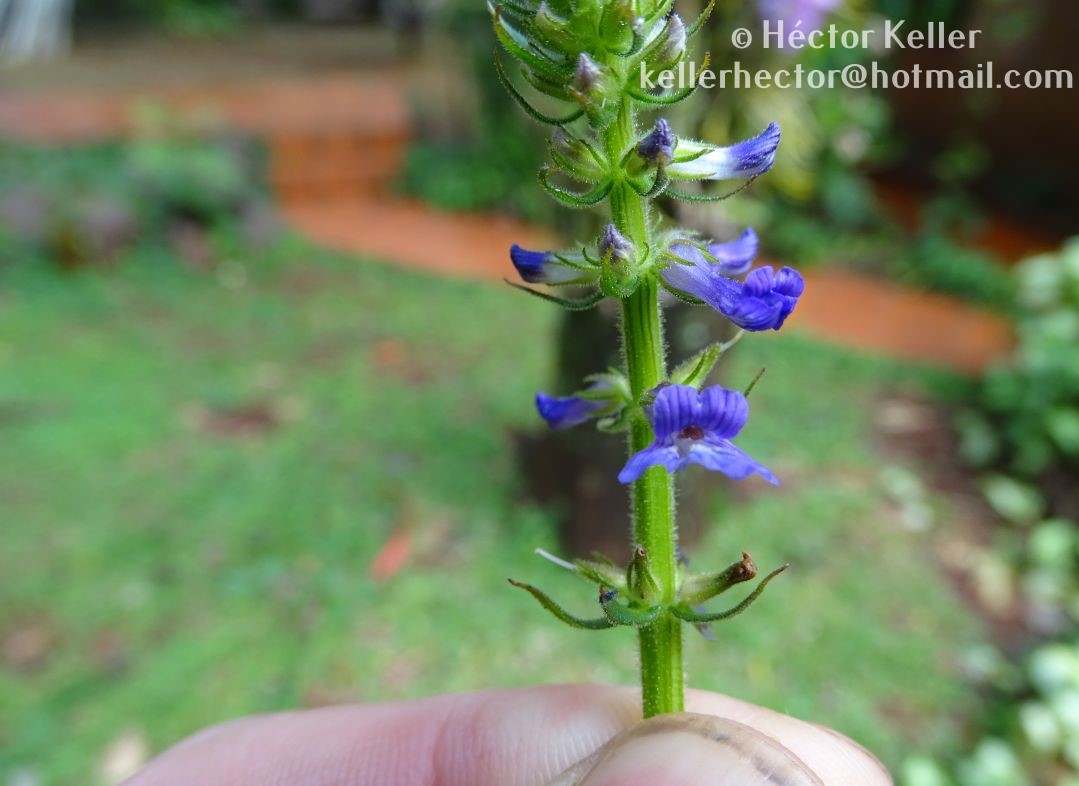 Sufrútice erecto a decumbente de 50-150 cm de alto. Tallos ascendentes con 4 costillas, varias ramas axilares, pubescentes con tricomas glandulares pedicelados, pluricelulares uniseriados, y tricomas eglandulares. Hojas opuestas, sésiles, estrechamente obovadas, de 23-65 × 8-35 mm, ápice agudo, base atenuada a auriculada, margen marcadamente serrado (más de 20 dientes a cada lado), pubescente con tricomas similares a los del tallo, con mayor cantidad de tricomas en las venas. Inflorescencia espiciforme laxa de hasta 30 cm de largo, con brácteas florales linear-lanceoladas de 10 mm de largo, ápice no curvado; flores sésiles, con dos bractéolas de 5 mm de largo, linear-lanceoladas. Cáliz pentámero, sépalos iguales, de 4 mm de largo, lineal- lanceolados, glandular-pubescentes. Corola violácea, tubular, de 8-10 mm de largo; lóbulos anteriores trilobados y pubescentes en la garganta con tricomas largos, lóbulos superiores emarginados; estambres 4, 2 filamentos breves de 1,2-2 mm de largo y 2 mayores de 4 mm de largo; anteras separadas por globos conectivos. Ovario ovoide, estilo recto, de 4 mm de largo, estigma lateralmente achatado. Cápsula ovoide, de 3-4 mm de largo, 4-valvar. Semillas elipsoides, de color marrón claro.