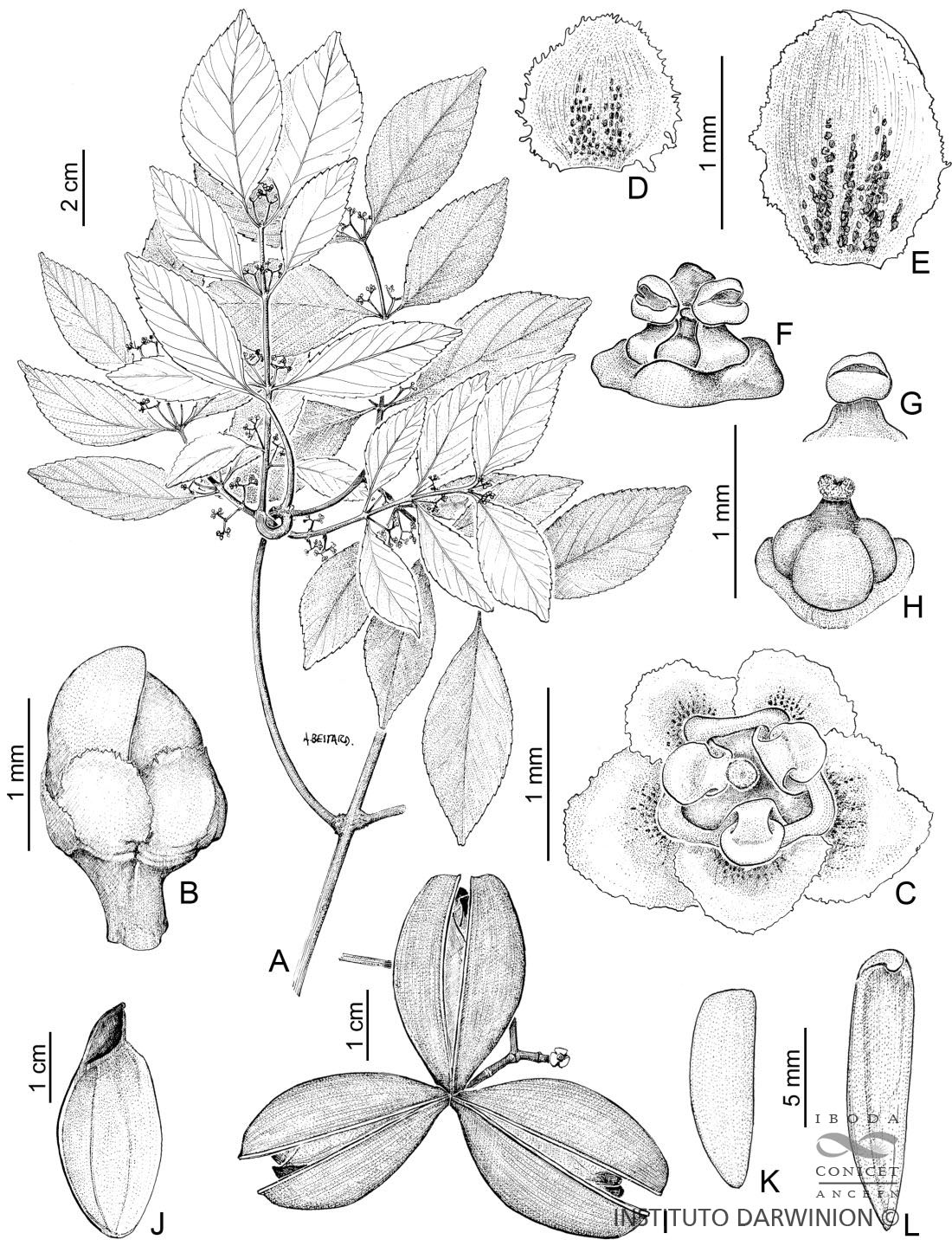 Lianas, raro arbustos o árboles, hasta de 6 m de alto. Ramas jóvenes subcilíndricas o sub 4-angulares, las viejas cilíndricas, lenticeladas. Estípulas triangulares, comúnmente denticuladas sólo en la porción basal; pecíolos de 7-9 mm de largo; láminas elípticas a obovadas, raramente espatuladas, de 5,7-6,6 × 2,1-3,5 cm, base cuneada o redondada, ápice agudo a acuminado, raramente obtuso, margen crenado a obscuramente crenado, membranáceas a cartáceas, cuando secas verdes con los nervios amarillentos, nervios secundarios prominentes en ambas caras. Inflorescencias pauci a multifloras, axilares, de tipo dicasio compuesto, raramente pleiocasio, eventualmente agregados en tirsos por la supresión de hojas en los nudos; pedúnculos de 11 a 15 mm de largo, raramente subnulos, con ramas sub 4- angulares; brácteas ciliadas o erosas; pedicelos de 0,5-1,4 mm de largo, articulados; bractéolas 2 por flor o ausentes. Flores rotáceas a campanuliformes; sépalos triangulares, ca. 0,2 × 0,6 mm, margen ciliado o denticulado; pétalos elípticos o rómbicos, de 1-1,2 × 0,4-1,1 mm, margen entero, papiloso, verdes o amarillentos; disco anular, circular o 5-angulado; estambres con filamentos unidos en la base o en un tubo, alargados o no en la base; óvulos 4 por lóculo. Mericarpos elipsoides a largamente elipsoides, de 3,5-7,8 × 2,3-3 cm, em sección transversal de 1-6 mm de largo, estriados, lustrosos, ápice acuminado. Semillas de 3,3-4,7 × 1-1,8 cm, en sección transversal de 2-3 mm de largo, núcleo seminífero elipsoide, castaño, ala elíptica, membranácea.