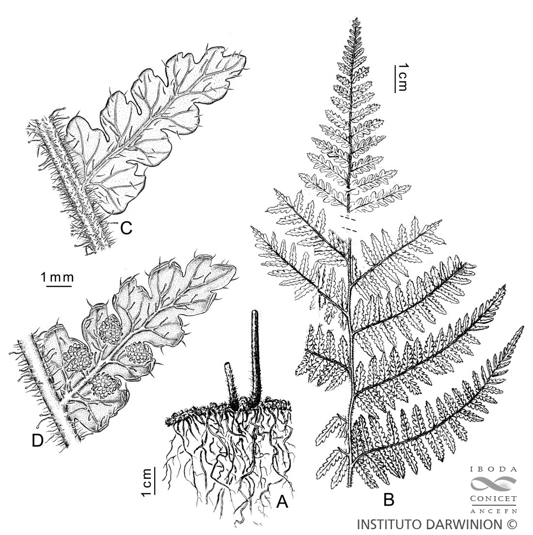 A. Porción del rizoma. B. Ápice de una fronde. C. Pínnula estéril mostrando venación e indumento. D. Pínnula fértil mostrando venación, indumento y posición de los soros.