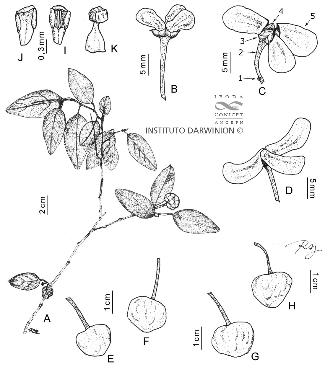 A. Rama fructífera. B. Flor. C. Flor con los pétalos patentes: 1. bractéola. 2. pedicelo. 3. sépalo. 4. pétalo interno. 5. ala del pétalo externo. D. Flor con pétalos direccionados hacia arriba. E, F, G y H. Frutos, mostrando diferentes tipos de excrecencias en la superficie. J. Estambre, vista dorsal. I. Estambre, vista ventral. K. Carpelo.