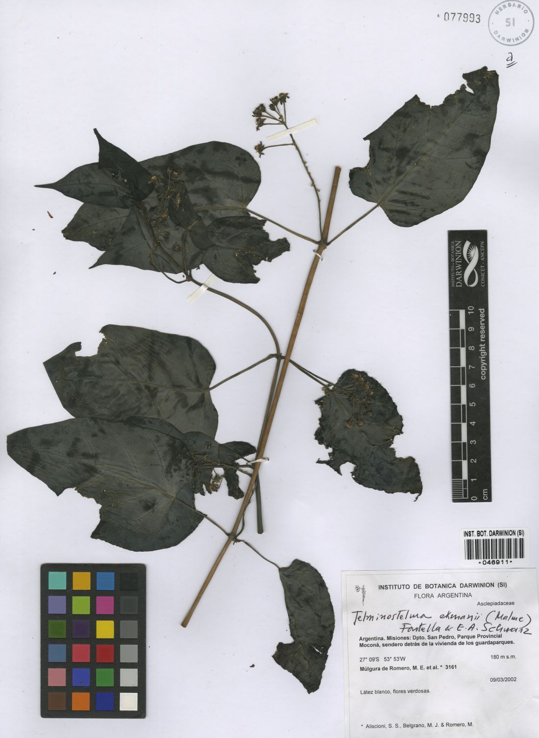 Subarbusto voluble, ramas glabras de 4-6 mm de diámetro; raíces tuberosas. Hojas con pecíolo glabro, de 2-8 cm de largo; lámina anchamente ovada, de 9-28 × 6-20 cm, membranácea, glabra en ambas caras y con coléteres en la base adaxial del pecíolo; frecuentemente con olor fétido. Inflorescencia multiflora, racemiforme o corimbiforme, extraaxilar, alterna; pedúnculo de 2-10 cm de largo, tomentoso-puberulento. Flores con pedicelo de 1-2 cm de largo; cáliz con lóbulos ovado-lanceolados de 3-4 × 1,5-2 mm, cara abaxial pubescente, cara adaxial glabra, borde ciliado, con 3-8 coléteres bajo el seno interno; corola con tubo brevísimo; lóbulos sublineales, carnosos, de 5-6 × 1,5-2 mm, dilatados en forma de bolsita hacia el ápice de la cara inferior; cara abaxial glabra, cara adaxial cubierta de diminutos tricomas; corona inserta en la base del ginostegio, blanca luego de la antesis, rosada antes de la absición; lóbulos sublineales, de 4 mm de largo, 2-furcados hacia el ápice en dos ramas largas y algo retorcidas; ginostegio largamente estipitado, de 4 mm de altura, cabeza estilar 5-gonal, plana; anteras de 1,5-2 mm de largo, con membrana apical reniforme; retináculo ovoideo-lanceolado, de 0,55-0,6 × 0,2-0,25 mm; caudículas descendentes, de 0,55-0,6 × ca. 0,1 mm; polinias péndulas, ovoideo-oblongas, de 0,65-0,7 × 0,25-0,3 mm. Folículos ovoides, de 22 × 8 cm, lisos, glabros, pericarpio grueso, esponjoso. Semillas comosas, obovadas, de 1,1-1,2 × 0,6-0,7 cm, superficie tuberculada en ambas caras en la zona apical, el margen suavemente dentado.