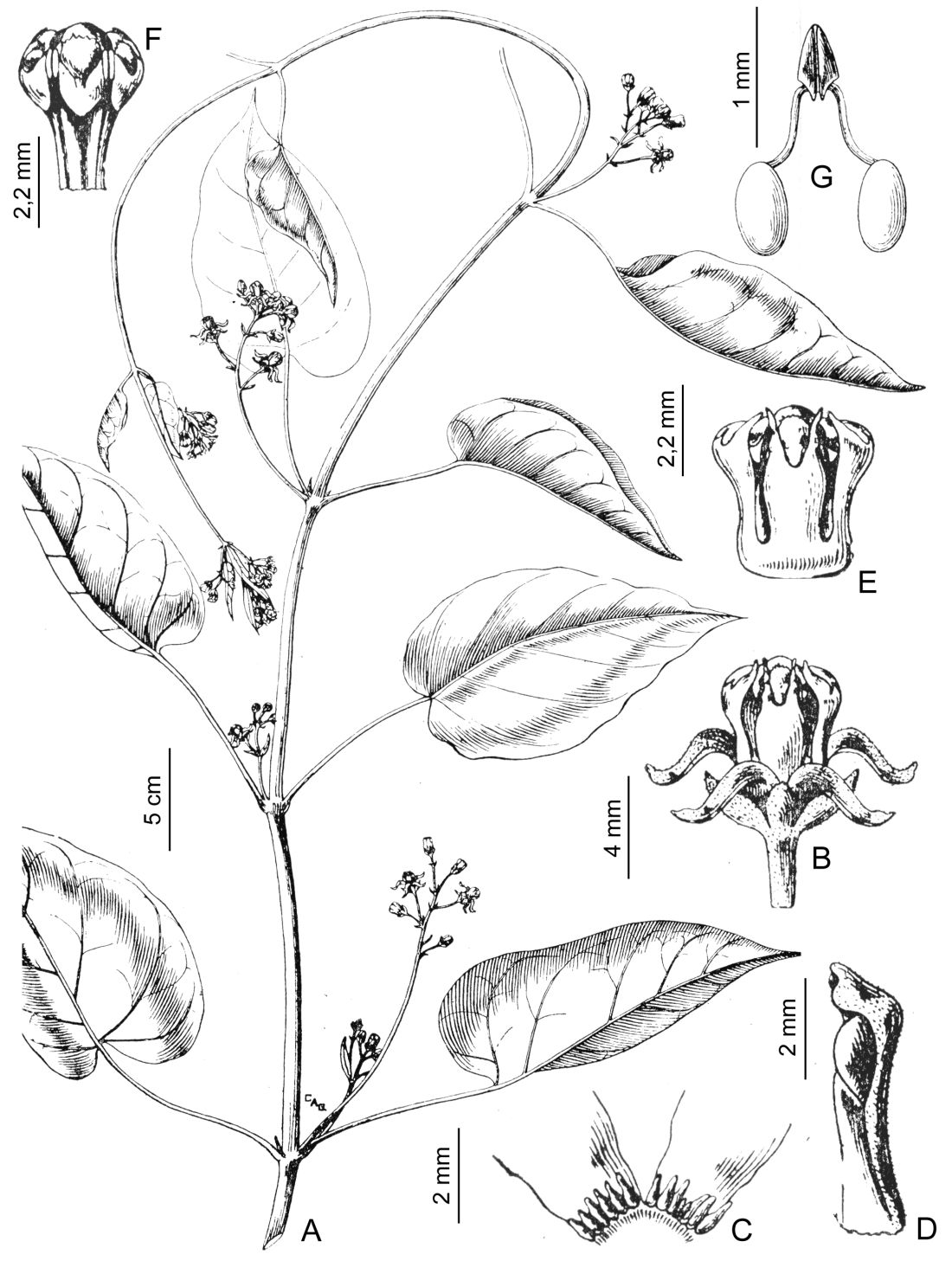 A. Rama florífera. B. Flor. C. Coléteres en el cáliz. D. Lóbulo de la corola. E. Corona. F. Ginostegio. G. Polinario. Tomado de Lilloa 23: 58, fig. 4. 1950 (sub Telminostelma ekmanii)