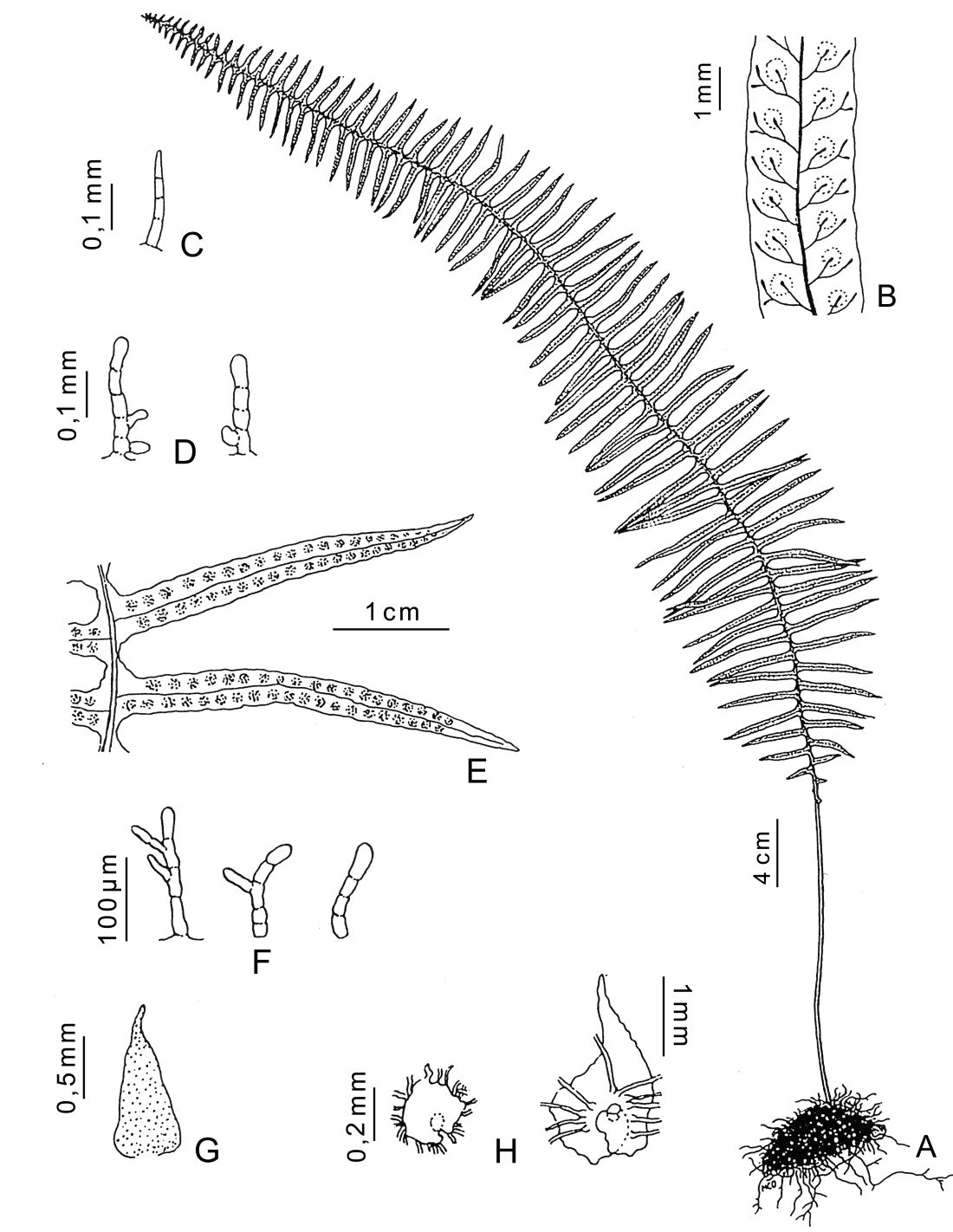 A. Planta. B. Porción de una pinna media mostrando la venación y posición de los soros. C. Tricomas setosos del ráquis. D. Tricomas ctenoides del ráquis. E. Par de pinnas, cara abaxial. F. Tricomas simples y ramificados del receptáculo. G. Escama rizomática (dibujada sin los tricomas). H. Escamas rizomáticas con tricomas.