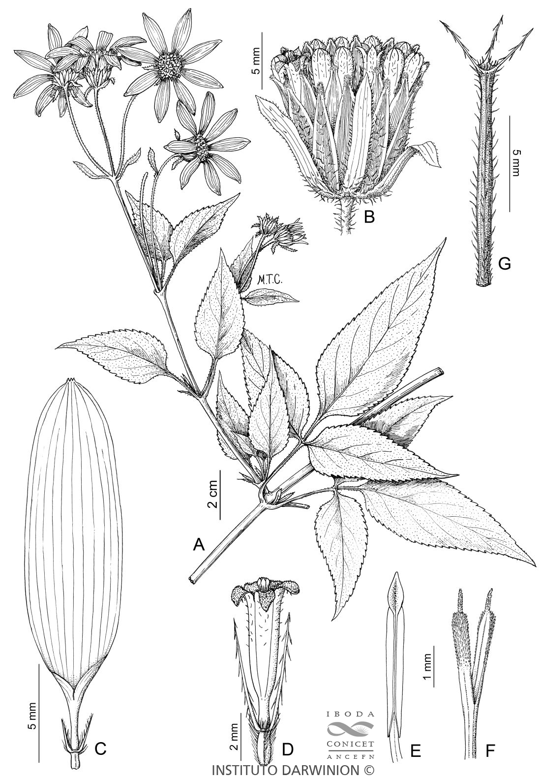A. Rama florífera. B. Capítulo. C. Flor del margen. D. Flor del centro. E. Estambre. F. Parte superior del estilo. G. Aquenio y papus.