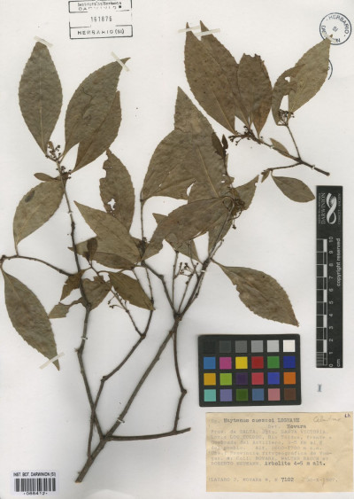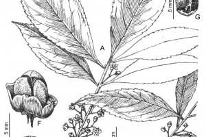 Arbustos o árboles hasta de 7 m de alto, inermes. Ramas jóvenes aplanadas con estrías longitudinales, rojizas, grisáceas cuando secas, glabras, sin lenticelas; ramas viejas cilíndricas, grisáceas. Hojas espiraladas, patentes; estípulas triangulares, de 0,7-1,5 mm de largo, caducas, margen fimbriado; pecíolos de 2(-4)-8 mm de largo, cilíndricos, glabros; láminas elípticas a elíptico-lanceoladas, de 3,9-10,6(-14) × 0,9-4,5 cm, base atenuada o aguda, ápice acuminado, no mucronado, margen crenado con una glándula en el ápice de cada crena, plano a levemente revoluto, cartáceas, glabras, discoloras cuando secas, castañas en la cara adaxial, verdes en la abaxial, nervio primario aplanado en la cara adaxial, prominente en la abaxial, nervios secundarios 3-5 pares, inconspicuos en la cara adaxial, aplanadas en la abaxial. Inflorescencias en cimas paucifloras con hasta 5 flores, más comúnmente con 3 flores; brácteas en la base, ovadas, de 1-2, 0,4-1 × 0,2-0,8 mm, fimbriadas; pedúnculos de 5-9 mm de largo; bractéolas en la base de los pedicelos, subtriangulares, de 1-2, 1-1,2 × 0,6-0,7 mm, fimbriadas; pedicelos de 1-4(-5) mm de largo, cilíndricos, glabros. Flores 5-meras, de 5-6 mm de diámetro en la antesis; sépalos subtriangulares, de 1-1,2 × 0,7-0,9(-1,1) cm, margen fimbriado; pétalos elípticos, de 2,2-2,6 × 1,8-2 cm, margen ondulado o fimbriado, glabros, blancos; estambres de 0,7-1 mm de largo, anteras oblongas; ovario 3-locular; óvulos 1 por lóculo. Cápsulas globosas, de 5-6,2 × 4,2-6,1 cm, 3-valvadas, glabras, pericarpio membranáceo, rojizas cuando maduras. Semillas elipsoides, de (1-)2-3, 3,5-4 × 2-2,6 cm, envueltas parcialmente, sólo en la base, por un arilo rojizo-amarillento.