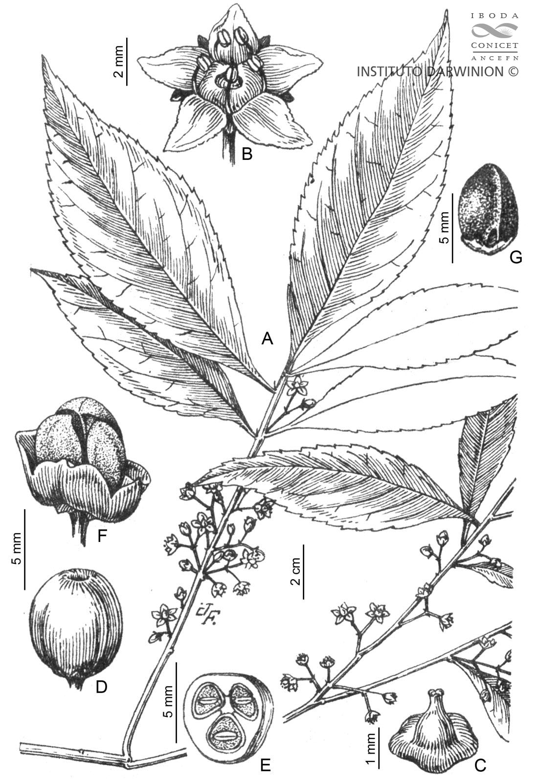 A. Rama florífera. B. Flor. C. Gineceo. D. Fruto. E. Fruto, transcorte. F. Fruto dehiscente. G. Semilla. Tomado de Lilloa 33: 332, fig. 3. 1973 (sub Maytenus cuezzoi).