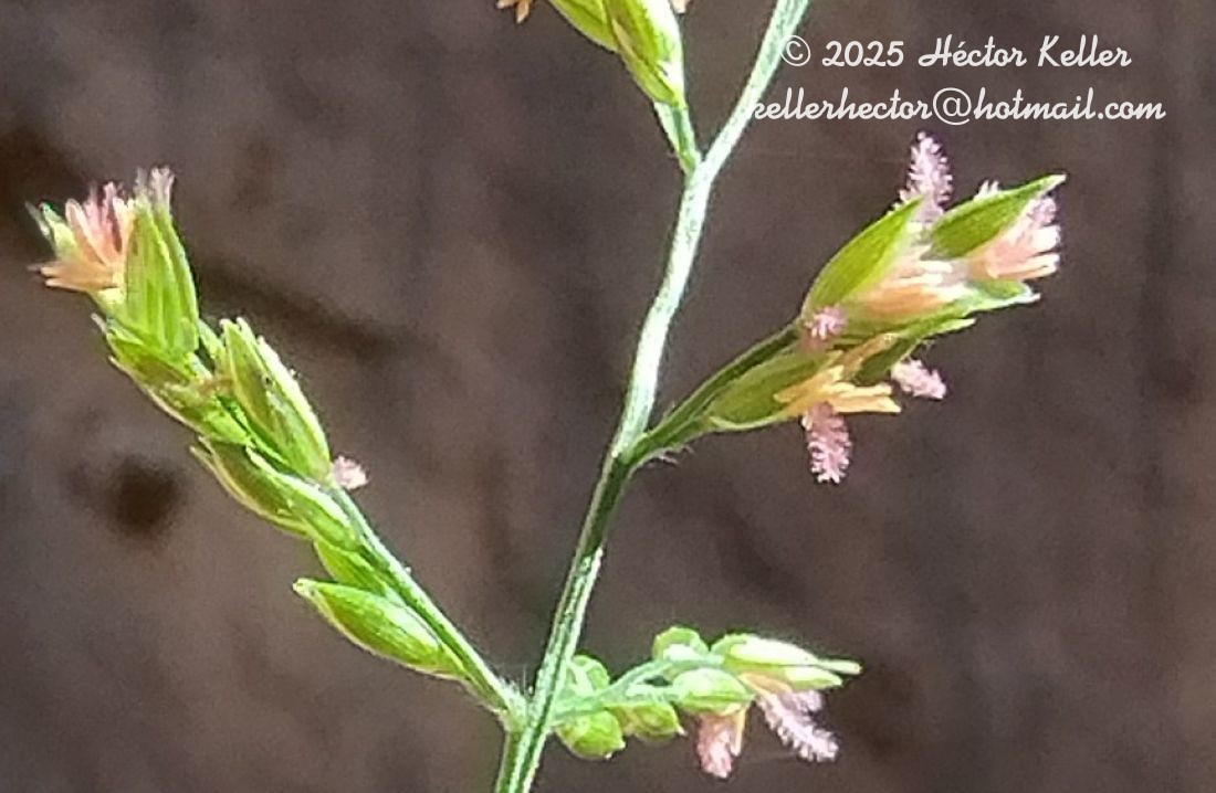 Plantas perennes, de 10-40 cm de alto; cañas largamente rastreras, decumbentes, ramificadas y arraigadas en los nudos inferiores; entrenudos de 1-5 cm de largo, glabros; nudos castaños, glabros o pilosos; vainas de 1-2,5 cm de largo, más cortas que los entrenudos, esparcidamente pilosas a glabrescentes, con un borde largamente pestañoso, el restante membranáceo; lígulas membranáceo-ciliadas, de menos de 1 mm de largo; cuello híspido; láminas ovadas a oblongo-lanceoladas, de 2-6 x 1-2,5 cm, esparcidamente pilosas a glabrescentes, de base subcordada, asimétrica, ápice acuminado, los bordes escabriúsculos, los inferiores ciliados. Inflorescencias compuestas o simples, terminales y axilares; inflorescencia terminal contraída, de 3-10 x 1-3 cm, largamente exerta; pedúnculo hasta de 11 cm de largo, glabro; eje principal anguloso, ligeramente escabriúsculo; pulvínulos pilosos; ramificaciones de primer orden alternas a subopuestas, adpresas o ligeramente divergentes, glabras, escabriúsculas; espiguillas solitarias o en pares, dispuestas regularmente a lo largo del raquis; pedicelos triquetros, escabriúsculos; panojas axilares menores. Espiguillas elipsoides, de 4,2-4,8 x 1,2 mm, glabras, verdosas; gluma superior y lemma inferior subiguales, superando en largo al antecio superior; gluma inferior de 3,3-4,2 mm de largo, ¾ o tan larga como la espiguilla, glabra o con escasos pelos en los márgenes, de ápice acuminado, nervio medio escabriúsculo en su porción superior, 3-nervia; gluma superior de 3,7-4,5 mm de largo, glabra, escabriúscula junto al ápice, 5-nervia; lemma inferior glumiforme, de 3,6-4,2 mm de largo, 5-nervia; pálea inferior de 2,8-3,3 mm de largo, anchamente elíptica, hialina, con los bordes denticulados; flor inferior estaminada o perfecta; estambres 3, anteras de 1,8 mm de largo; gineceo cuando presente con 2 ramas estilares libres; antecio superior elipsoide, de 2,5 x 1 mm de ancho, glabro, liso, lustroso; lemma 5-nervia, con 2 excavaciones en su base de 0,4-0,7 mm de largo; cariopsis elipsoide, de 1,4 x 0,8 mm de ancho, castaño; hilo subbasal, oblongo; embrión ? del largo de la cariopsis.