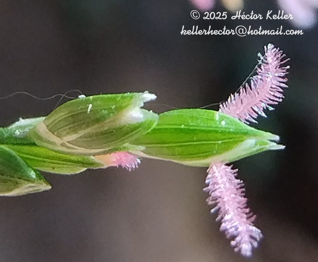 Plantas perennes, de 10-40 cm de alto; cañas largamente rastreras, decumbentes, ramificadas y arraigadas en los nudos inferiores; entrenudos de 1-5 cm de largo, glabros; nudos castaños, glabros o pilosos; vainas de 1-2,5 cm de largo, más cortas que los entrenudos, esparcidamente pilosas a glabrescentes, con un borde largamente pestañoso, el restante membranáceo; lígulas membranáceo-ciliadas, de menos de 1 mm de largo; cuello híspido; láminas ovadas a oblongo-lanceoladas, de 2-6 x 1-2,5 cm, esparcidamente pilosas a glabrescentes, de base subcordada, asimétrica, ápice acuminado, los bordes escabriúsculos, los inferiores ciliados. Inflorescencias compuestas o simples, terminales y axilares; inflorescencia terminal contraída, de 3-10 x 1-3 cm, largamente exerta; pedúnculo hasta de 11 cm de largo, glabro; eje principal anguloso, ligeramente escabriúsculo; pulvínulos pilosos; ramificaciones de primer orden alternas a subopuestas, adpresas o ligeramente divergentes, glabras, escabriúsculas; espiguillas solitarias o en pares, dispuestas regularmente a lo largo del raquis; pedicelos triquetros, escabriúsculos; panojas axilares menores. Espiguillas elipsoides, de 4,2-4,8 x 1,2 mm, glabras, verdosas; gluma superior y lemma inferior subiguales, superando en largo al antecio superior; gluma inferior de 3,3-4,2 mm de largo, ¾ o tan larga como la espiguilla, glabra o con escasos pelos en los márgenes, de ápice acuminado, nervio medio escabriúsculo en su porción superior, 3-nervia; gluma superior de 3,7-4,5 mm de largo, glabra, escabriúscula junto al ápice, 5-nervia; lemma inferior glumiforme, de 3,6-4,2 mm de largo, 5-nervia; pálea inferior de 2,8-3,3 mm de largo, anchamente elíptica, hialina, con los bordes denticulados; flor inferior estaminada o perfecta; estambres 3, anteras de 1,8 mm de largo; gineceo cuando presente con 2 ramas estilares libres; antecio superior elipsoide, de 2,5 x 1 mm de ancho, glabro, liso, lustroso; lemma 5-nervia, con 2 excavaciones en su base de 0,4-0,7 mm de largo; cariopsis elipsoide, de 1,4 x 0,8 mm de ancho, castaño; hilo subbasal, oblongo; embrión ? del largo de la cariopsis.