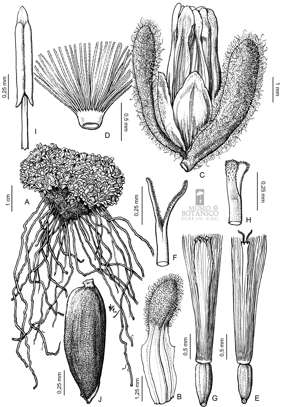 A. Planta. B. Hoja. C. Capítulo. D. Papus. E. Flor del margen. F. Ramas del estilo de la flor marginal. G. Flor del centro. H. Ramas del estilo de la flor del centro. I. Estambre. J. Aquenio.