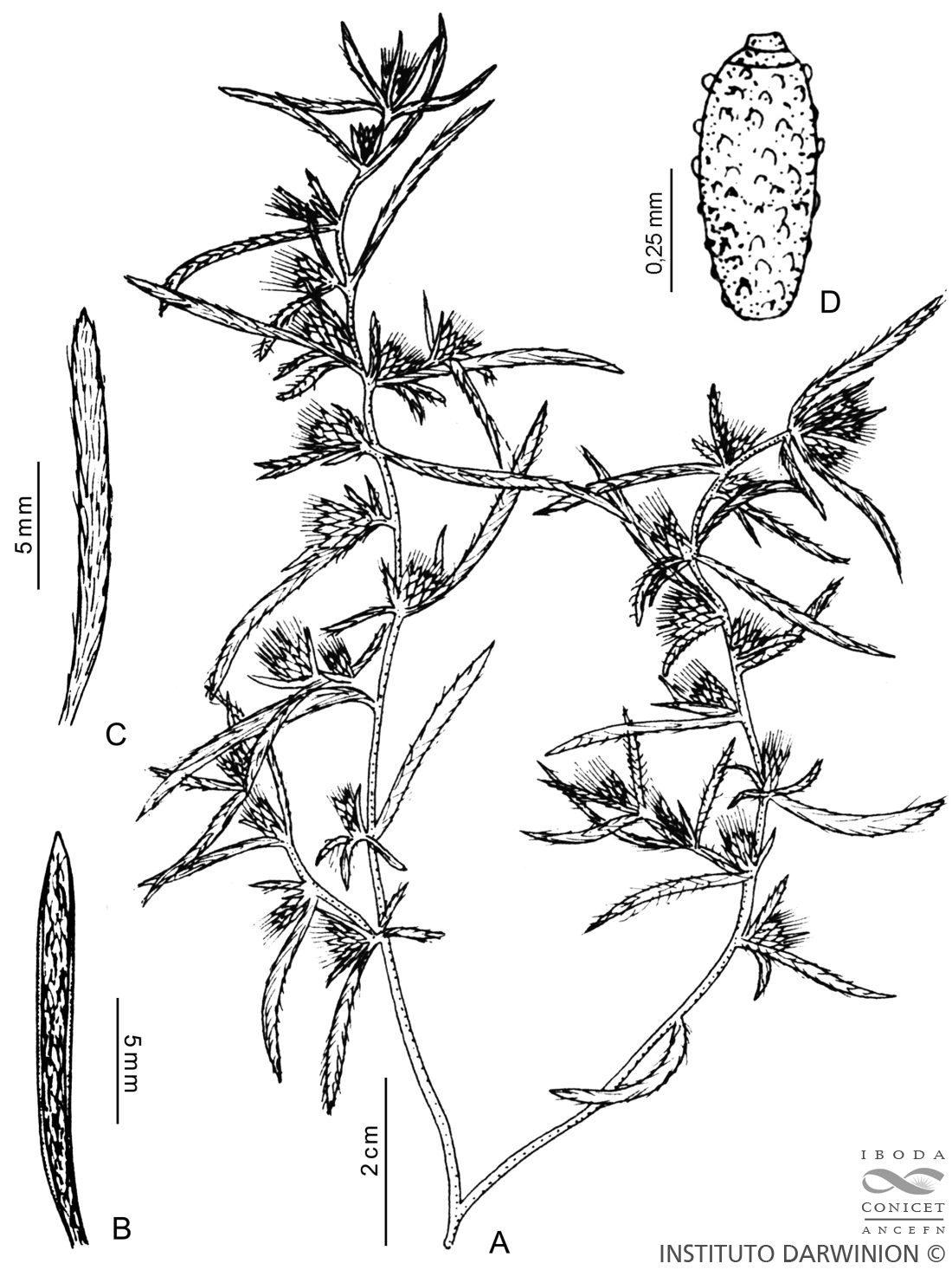 Hierbas perennes, multicaules, de 15-20 cm de alto, laxamente albo-lanosas. Tallos débiles, tendidos, simples o ramificados. Hojas alternas, sésiles, lineares, de 1,4-3,8 cm × 1-2,5 mm, atenuadas en la base, agudas en el ápice, levemente revolutas en los márgenes, laxamente lanosas en la cara superior y blancolanosas en la inferior. Capítulos heterógamos, sésiles, solitarios o 2-3 en la axila de las hojas, formando espigas foliosas de glomérulos. Involucro cilíndrico, ca. 6 × 1,5-3 mm; filarios 12-15, los exteriores ovados, agudos y lanuginosos en el dorso, los interiores lineares, agudos y glabros, con lámina parda y esteroma entero. Flores del margen ca.18, pistiladas, corolas de 4,5-5 mm de largo; flores del centro ca. 2, perfectas, corolas 4-5-lobadas, tubo cilíndrico, apenas dilatado en la parte superior, de 4,5-5 mm de largo. Anteras 4 ó 5; ramas del estilo subgudas a redondeadas. Aquenios de 0,5-0,8 mm de largo, con pelos globosos cortos. Papus blanco, de 4,7-5 mm de largo.
