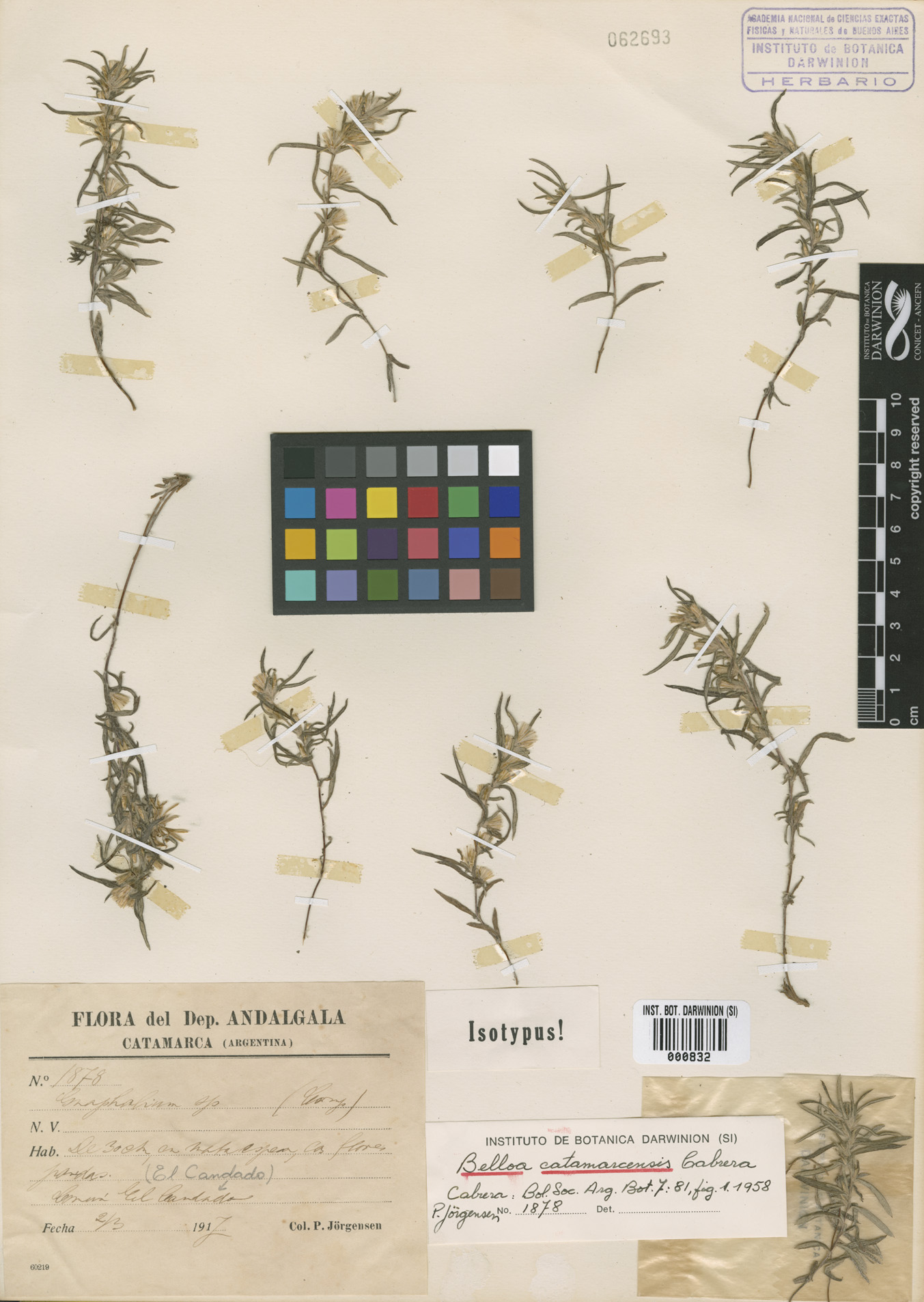Hierbas perennes, multicaules, de 15-20 cm de alto, laxamente albo-lanosas. Tallos débiles, tendidos, simples o ramificados. Hojas alternas, sésiles, lineares, de 1,4-3,8 cm × 1-2,5 mm, atenuadas en la base, agudas en el ápice, levemente revolutas en los márgenes, laxamente lanosas en la cara superior y blancolanosas en la inferior. Capítulos heterógamos, sésiles, solitarios o 2-3 en la axila de las hojas, formando espigas foliosas de glomérulos. Involucro cilíndrico, ca. 6 × 1,5-3 mm; filarios 12-15, los exteriores ovados, agudos y lanuginosos en el dorso, los interiores lineares, agudos y glabros, con lámina parda y esteroma entero. Flores del margen ca.18, pistiladas, corolas de 4,5-5 mm de largo; flores del centro ca. 2, perfectas, corolas 4-5-lobadas, tubo cilíndrico, apenas dilatado en la parte superior, de 4,5-5 mm de largo. Anteras 4 ó 5; ramas del estilo subgudas a redondeadas. Aquenios de 0,5-0,8 mm de largo, con pelos globosos cortos. Papus blanco, de 4,7-5 mm de largo.