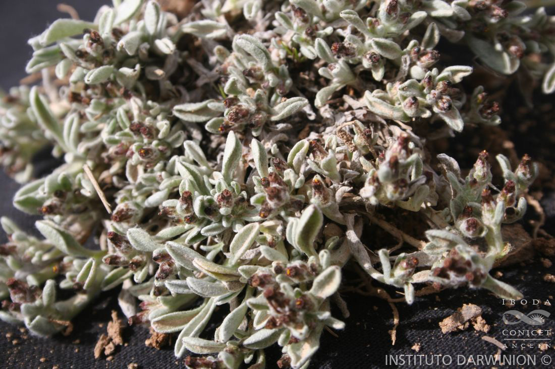 Hierbas perennes, subcespitosas, muticaules, de 1,5-3 cm de alto, densamente albo-lanosas. Tallitos delgados, tendidos, luego ascendentes, simples, subáfilos en la parte media. Hojas inferiores arrosetadas, sésiles, obovadas, de 5-18 × 2-5 mm, apenas atenuadas en la base, obtusas en el ápice, densamente gríseolanosas en ambas caras, excepto en la base que es apenas dilatada y adpresa al tallo; hojas caulinares amontonadas en el extremo de los tallitos y 1 ó 2 pares de hojas subopuestas en la parte media. Capítulos heterógamos, sésiles, solitarios en la axila de las hojas superiores. Involucro cilíndrico-acampanado, de 4-6 × 1,5-7 mm; filarios 12-22, los exteriores ovados, agudos y lanuginosos en el dorso, los interiores linear-obovados, obtusos y glabros, con lámina parda a castaña y esteroma entero. Flores del margen 18-56, pistiladas, corolas de 2,5-5,5 mm de largo; flores del centro 3-6, perfectas, corolas 4-5-lobadas, tubo cilíndrico, de 2,5-4,8 mm de largo. Anteras 4-5. Ramas del estilo redondeadas a truncadas. Aquenios de 0,5-1 mm de largo, con cortos pelos dobles, globosos. Papus blanco de 2,5-5,5 mm de largo.