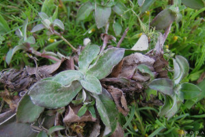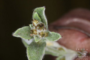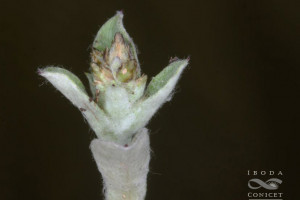 Hierbas perennes, subcespitosas, muticaules, de 2,5-4 cm de alto, laxamente albo-lanosas. Tallitos delgados, decumbentes, simples, áfilos o subáfilos en la parte media. Hojas inferiores arrosetadas, sésiles, obovadas, de 2-2,8 cm × 5-7 mm, apenas atenuadas en la base, obtusas en el ápice, laxamente lanosas a glabrescentes y verdosas en la cara superior y blanco-lanosas en la inferior; hojas caulinares amontonadas en el extremo del tallo y a veces 1-2 pares de hojas subopuestas. Capítulos heterógamos, sésiles, en la axila de las hojas superiores. Involucro cilíndrico-acampanado, de 8-10 × 6-15 mm; filarios ca. 25, los exteriores ovados, obtusos y lanuginosos en el dorso, los interiores linear-obovados, subobtusos y glabros, con lámina pardo-rojiza y esteroma entero. Flores del margen ca. 50, pistiladas, corolas de 5-6,5 mm de largo; flores del centro ca. 10, perfectas, corolas 5-lobadas, tubo cilíndrico, de 5-6 mm de largo. Anteras 5; ramas del estilo redondeadas. Aquenios de 1-1,5 mm de largo, con pelos globosos cortos. Papus blanco, de 5-6,5 mm de largo.
