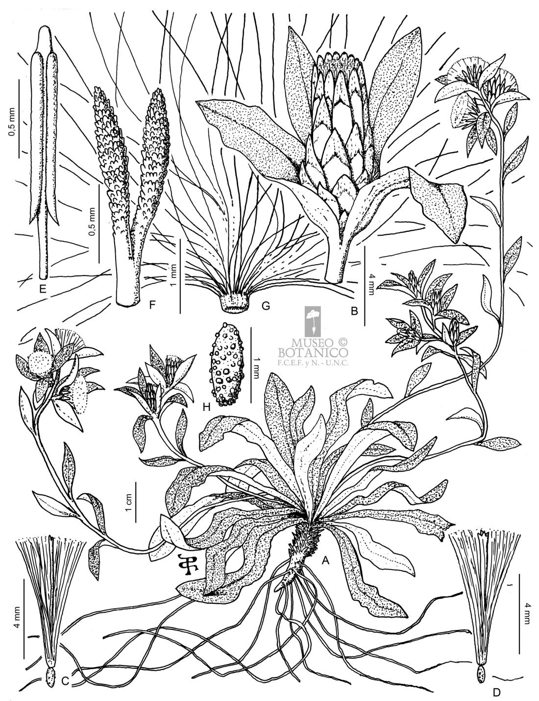 A. Planta. B. Capítulo. C. Flor del margen. D. Flor del centro. E. Estambre. F. Parte superior del estilo. G. Papus mostrando los pelos unidos en un anillo basal. H. Aquenio con pelos cortos y globosos.