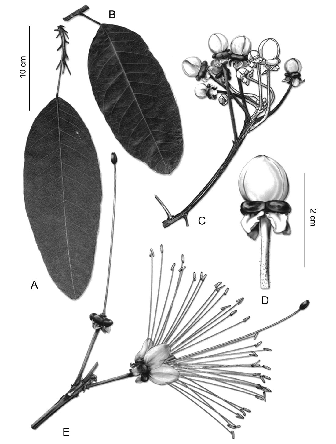 Árbol de 10-14 m de alto, con ramas glabras, corteza granulada. Hojas simples, alternas, dísticas o espiraladas; pecíolo de 3-7 cm de largo, pulvinado en la base y hacia el ápice; lámina ovado-lanceolada a largamente ovado-lanceolada, de 15-30 × 4-11 cm, base redondeada, ápice agudo a obtuso, verde oscura, cara adaxial glabra, la abaxial velutina; estípulas triangulares de menos de 1 mm de largo. Inflorescencias corimbiformes; pedúnculo de 2-3 mm de largo. Flores blanquecinas; sépalos ovado-triangulares, de 3,8-4,1 × 4 mm; pétalos oblongo-elípticos a obovados, de 14,8-15,2 × ca. 10 mm, glabros; nectarios 4 en la base del receptáculo, carnosos; estambres 35-50, filamentos de 4-4,7 mm de largo; anteras de 4-5 mm de largo; ovario de contorno oblongo, de 5,8-6,2 × 1,8-2,2 mm, glabro; estilo corto, estigma sésil, discoide; ginóforo de 8-8,5 cm de largo. Fruto una baya ovoide o de contorno oblongo, de 7-10 × 2,5-3 cm. Semillas numerosas, castañas.