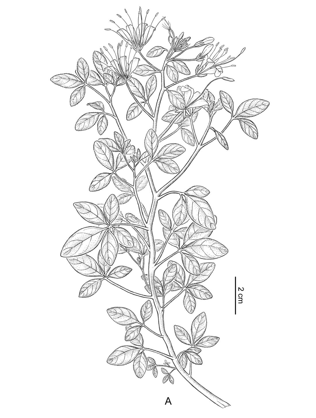 Subarbustos de 0,8-1 m de alto; ramas glandular-puberulentas a glabrescentes. Hojas con pecíolos de 2,5-4 cm de largo, inermes, puberulentos; espinas estipulares de 1-2 × 1 mm, rectas, que faltan en algunos individuos; láminas 3-5 folioladas; peciólulos de 2-4 mm de largo inermes, puberulentos; folíolos ovados a elípticos u oblanceolados, de 1,8-5 × 1-2 cm, basalmente cuneados u obtusos, apicalmente agudos, apiculados, ambas caras glabras, nervadura central y venas secundarias glabras, ciliadas, sin espinas. Inflorescencia en racimos corimbiformes, de 20-30 cm de largo, terminales; brácteas con pecíolos de 2-3 mm de largo, puberulentos y lámina ovada a elíptica, de 15-23 × 5-7 mm, basalmente obtusa o cuneada, apicalmente aguda, apiculada, puberulentas en ambas caras, ciliadas. Flores con pedicelos de 15-25 mm de largo, densamente puberulentos; sépalos triangulares a lanceolados, de 4-5 × 1 mm, acuminados, dorso densamente puberulento, ciliados; pétalos obovados a ampliamente obovados, de 6-8 × 3-4 mm, basalmente contraídos en una garra de 6-8 mm de largo, apicalmente obtusos, glabros, blancos; nectario cónico, carnoso, discreto, obsoleto en el fruto; filamentos estaminales de 20-35 mm de largo, violáceos, anteras 4-5 mm de largo; ovario elipsoide, de 2 mm de largo, glabro; estilo ausente, estigma discoide, sésil. Frutos fusiformes a oblongos, de 3-3,5 × 0,3-0,7 cm, glabros; ginóforo de 30-40 mm de largo. Semillas suborbiculares, de 2,5-3 × 3 mm, longitudinalmente estriadas con crestas transversales agudas, hendiduras anchas, cubiertas por un arilo opaco que conecta las garras.