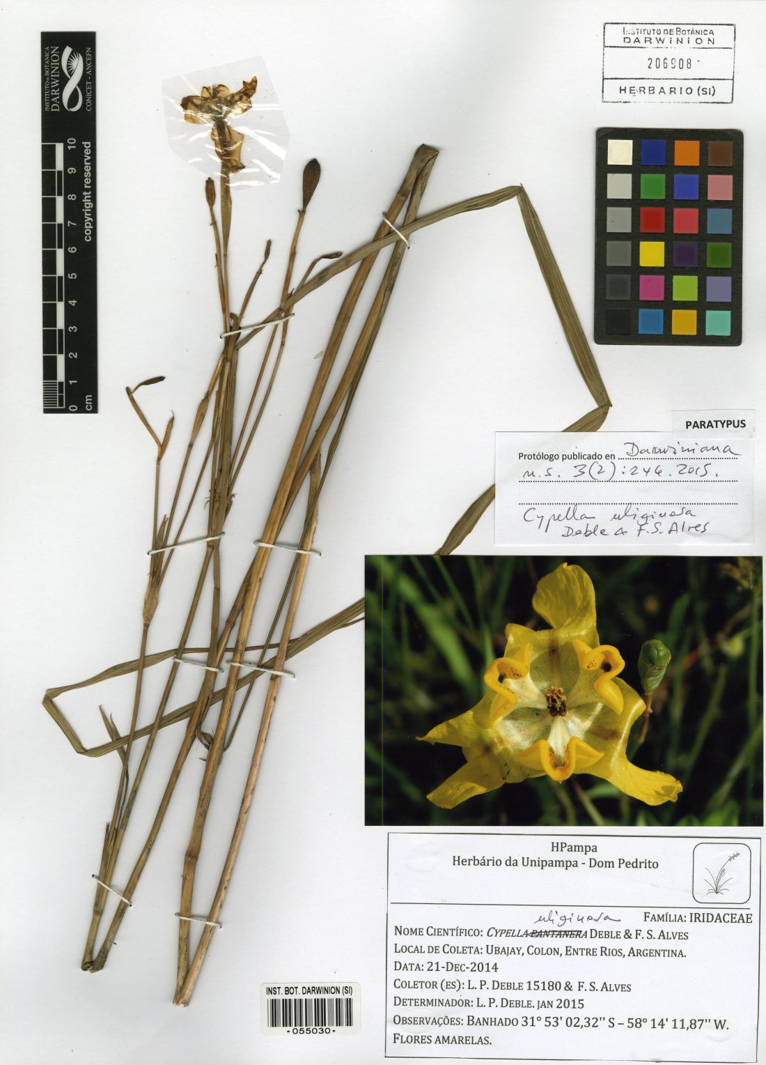 Material Tipo: Argentina. Corrientes. San Martín, La Cruz, Provincial Route 114, close to the Bañado Guaviaraví, in boggy land, flowers pale-yellow, 22 Dic 2014, L.P. Deble & F.S. Alves 15181 (holotipo, SI; isotipo, MVFA)