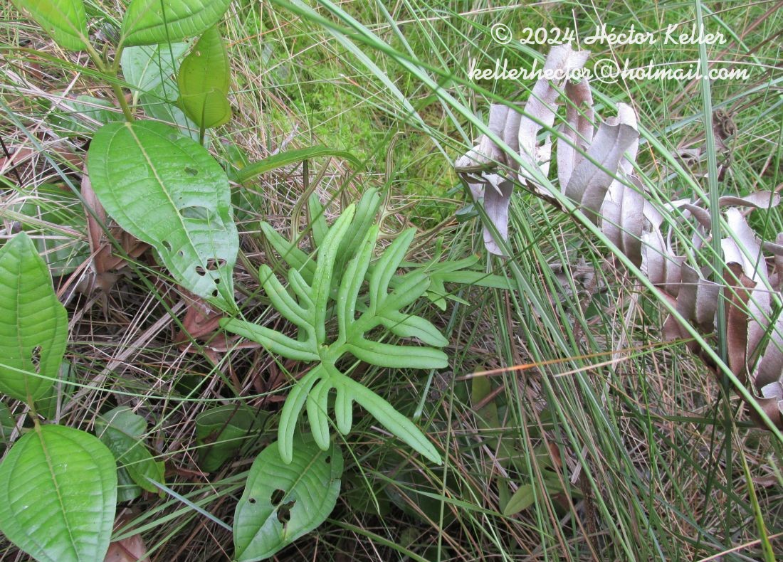 Rizomas rastreros, ca. 5 cm de diámetro, oscuros, escamosos en el ápice; escamas filiformes, hasta de 4 × 0,5 mm, inconspicuamente dentadas, con una banda central castaño-oscurs. Frondes dimorfas; pecíolos teretes, castaños, glabros; pecíolos hasta de 50 cm de largo en las frondes fértiles, castaño oscuros a negruzcos; láminas de contorno pentagonal, 2-pinnatilobado-pinnatisectas, subcoriáceas, margen reflexo, crenado; segmentos lasciniados; costas castaño oscuras, inmersas en la haz y sobresalientes en el envés; venación furcada, anastomosada completamente en los bordes, formando un vena colectora casi continua, sorífera. Pseudoindusio continuo, subterminal. Esporangios en cenosoros. Esporas triletes, subtriangulares a esferoidales en vista polar y superficie crestada.
