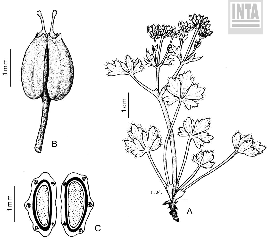 Hierbas perennes, ascendentes a erectas, de 3-7 cm de alto; tallos simples o ramificados desde la base; rizoma delgado. Hojas basales rosuladas, de 15-70 mm de largo, pecioladas, cartáceas; lámina anchamente ovada a orbicular, de 6-15 × 7-20 mm, 3-5-palmatisecta, los segmentos obovados a elípticos, planos, 3-7-lobados, los últimos segmentos redondeados, margen densamente ciliado en la parte distal o totalmente; pecíolos de 1,5-5 cm de largo; base foliar dilatada, membranácea, con un par de estípulas parcial o completamente adnatas, oblongas, escariosas, margen fimbriado o ciliado; hojas caulinares superiores subsésiles. Umbelas 4-10-floras, perfectas, agrupadas en dicasios; pedúnculos de 0,5-1,5 cm de largo; involucro de 3-7 brácteas de 2-5 mm de largo, enteras o algo lobadas, notablemente ciliadas, libres. Flores verdes o purpúreas; cáliz reducido a dientes triangulares; pétalos ovados, obtusos, de 1 mm de largo; pedicelos de 2-4 mm de largo, pubérulos, desiguales. Frutos subalados, de contorno ovoide, de 1,5-2 × 1-1,5 mm, comprimidos dorsalmente. Carpóforo cortamente 2-fido en el ápice.