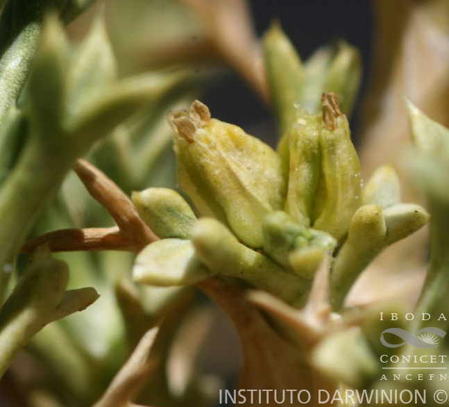 Subarbustos androdioicos formando matas de 5-30 cm de alto y 15-30 cm de diámetro, bajas, irregulares, laxas, resinosas; ramas viejas cubiertas por restos foliares persistentes. Hojas imbricadas, pecioladas, de (11-)13-17(-19) mm de largo, rígidas; lámina de (4-)5-7(-8) × (5-)6-10(-11) mm, 3-secta, con el segmento central de 4-6(-7) × (1-)1,2-1,6(-2) mm; segmentos divergentes, angostamente triangulares a triangulares, cilíndricos, margen entero, glabros, ápice agudo, espinoso, punzante; pecíolos de (2-)3-5(-7) mm de largo; base foliar amplexicaule, membranácea, margen escasamente ciliado, raro sin cilias, sin estípulas. Umbelas muy por debajo del nivel de las hojas, con (2-)4-6 flores perfectas o 7-12(-13) flores estaminadas; pedúnculos de 3-5(-7) mm de largo, glabros; involucro de (3-)4- 5(-6) brácteas de (2-)3-3,5(-4) mm de largo, margen entero, connadas casi completamente, glabras en el interior. Flores amarillas; cáliz reducido a dientes triangulares; pétalos ovados, de 1,5-2 × 1-1,8 mm; pedicelos de 2-4(-5) mm de largo, glabros. Frutos alados, de contorno elíptico, de (3-)4-5 × (2-)3-4 mm, poco comprimido dorsalmente; alas más angostas que el cuerpo del fruto, paralelas. Carpóforo libre, entero o cortamente 2-fido.