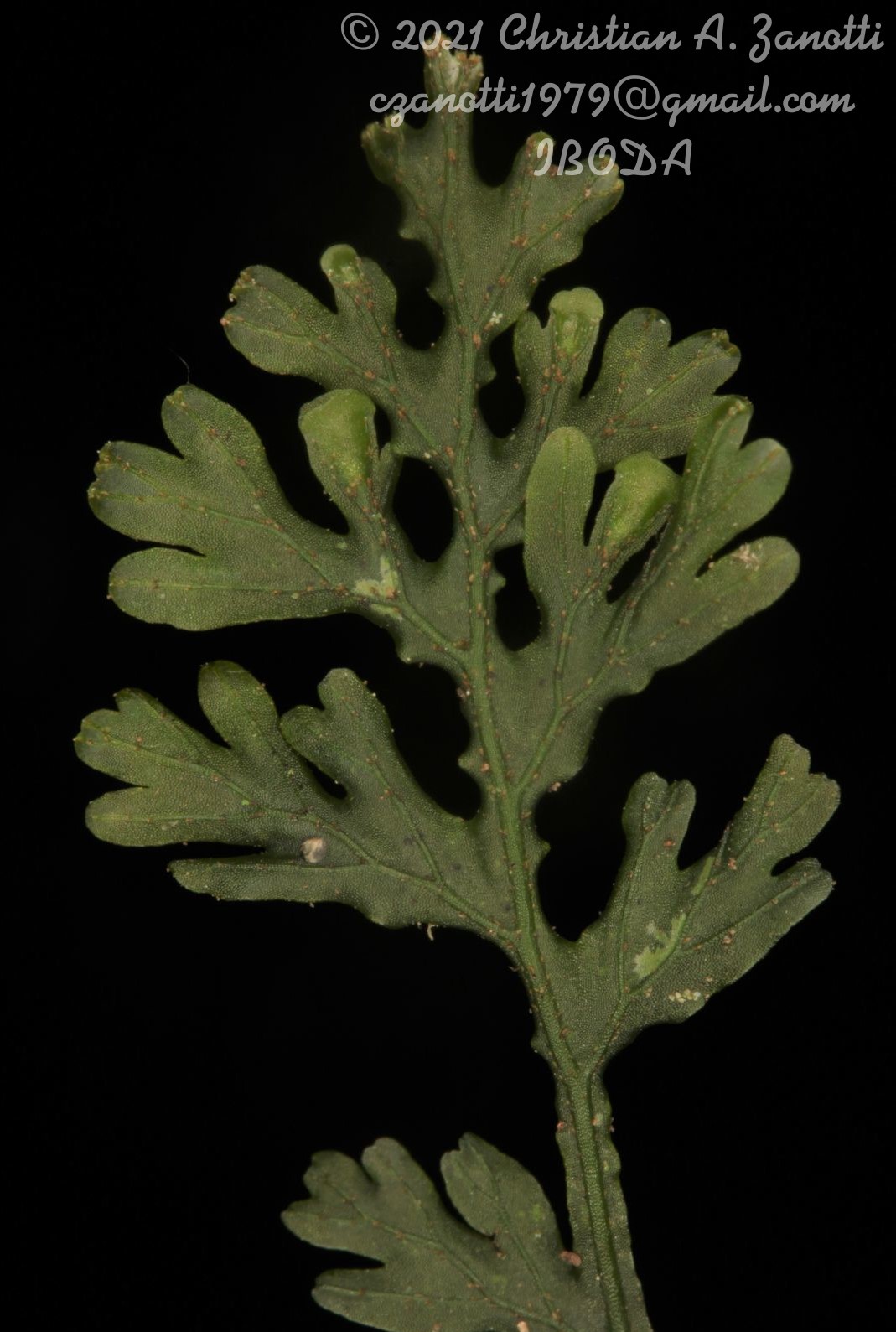 Epiphytic or lithophytic ferns. Rhizomes longcreeping, filiform, branched, c. 0.3 mm in diameter, densely covered with long, slender, simple, dull brown hairs, rootless or with root-like shoots covered by the same hairs as on rhizomes. Fronds up to 2–4 cm apart. Stipes 0.5–3.0 cm long, fully winged or winged at the upper part, with base thickened, blackish, bearing hairs similar to those on the rhizomes, other parts flattened or shallowly grooved ventrally, with short, pale brown clavate hairs on entire surface. Laminae 3.0–10.0(–15.0) × 1.0–4.0 cm, green or olive-green, diaphanous, glabrous, narrowly oblong-elliptic to narrowly ovate-elliptic, or ovate, or slightly lanceolate with well attenuated to sharp apex, bipinnatifid to tripinnatifid, and with anadromous venation. Rachis widely winged with mostly significantly undulate margins. Pinnae alternate, pinnatifid to bipinnatifid, ovate or lanceolate to oblong, with margin base mostly undulate. Segments entire, linear, apically emarginate, often with undulating margins, and sometimes but not always with longitudinal folds parallel to true veins (especially when dry), false veins absent. Costae and veins prominent on both sides, with clavate hairs similar to those on the stipe. Lamina cells thin-walled, slightly elongate, mostly hexagonal. Sori paratactic, adaxially borne on the proximal pinnae and/ or pinnules, (4–)6 to more than 15 (in largest specimens) per fertile frond; indusia obconical to campanulate, 1.0– 1.5 × 0.8–1.2 mm, slightly bordered on both sides by laminar cells, forming a wing, and with few clavate hairs; mouth of indusia slightly dilated; receptacles cylindrical and filiform, short to long-exerted up to twice or more the sorus length (Ponce et al. 2017: 13)