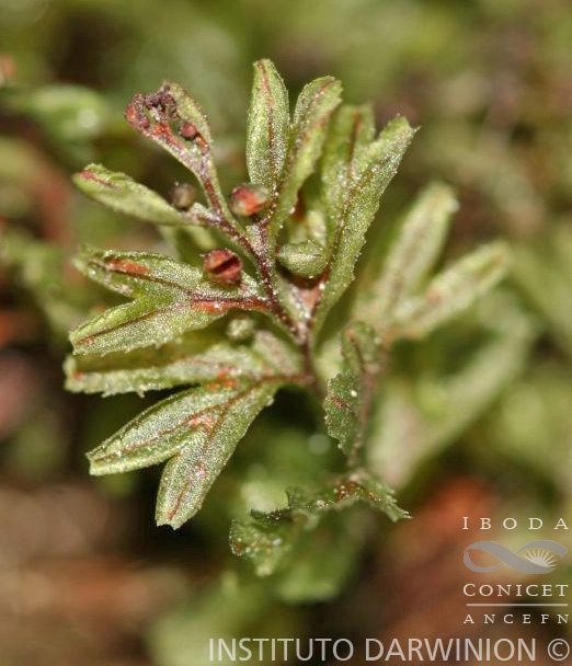 Rizomas filiformes, castaño oscuras, largamente rastreros, de 0,14-0,30 mm de diámetro, usualmente con tricomas ferrugíneos de 0,3-0,6 mm de largo; raíces delicadas. Frondes distanciadas entre sí, monomórficas, de 3,3-10 cm de largo; pecíolos delgados, castaño oscuros, de 0,5-2,5 cm x 0,1 mm, no alado, con tricomas 2-celulares dispersos, de 0,30-0,46 mm de largo, con célula apical ovoides, 2-3 ceves más larga que las células basales; láminas ovado-lanceoladas a linear-lanceoladas, de base truncada y ápice agudo, pinnado-pinnatifidas a 3-4-pinnadas, de 2,7-9 x 0,5-1,2 cm, esparcidamente pubescentes sobre raquis y venas, los tricomas similares a los del pecíolo; ráquis castaño oscuros, alados, especialmente desde el 4to-7mo par de pinnas y hacia el ápice; pinnas 6-12, flabeladas a rómbicas o trapezoides, distantes, ascendentes; segmentos 2-4. 3-4-pinnatifidos, las pinnas basales divididas en ambos lados, las apicales más desarrolladas acroscópicamente; últimos segmentos lineares, de 0,8-1 mm de largo, de ápice obtuso y margen aserrado, 1-nervios; venación pinnada o anádroma; soros 1 por pinna (raro 2), paratácticos, terminales sobre un segmento subaxilar, breve y angostamente alado; indusio ovado, no inmerso en la lámina, con la base engrosada, 2-labiado, los labios más largos que la mitad de la longitud del soro, con márgenes erosos o denticulados; receptáculo alargado, a veces fusiforme, no exerto, con ca. 30 esporangios.