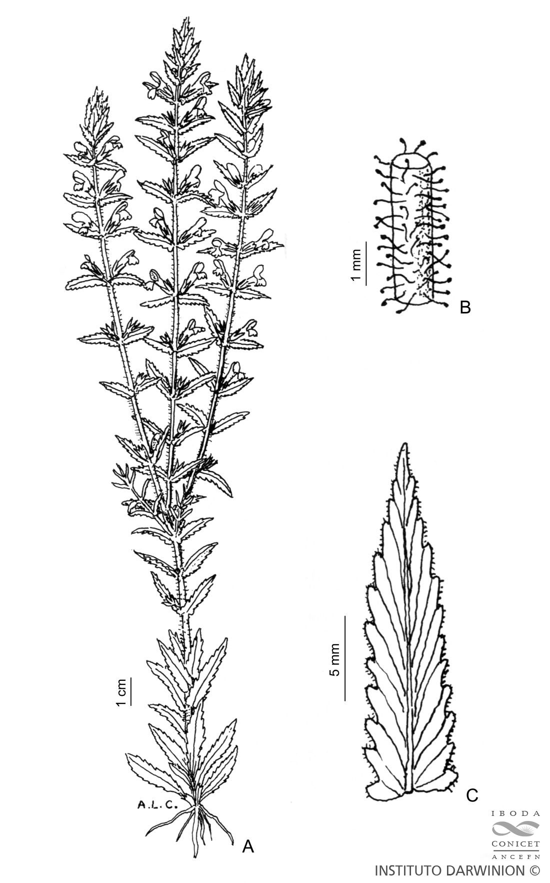 A. Planta. B. Detalle pubescencia tallo. C. Hoja.