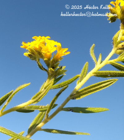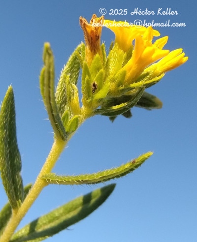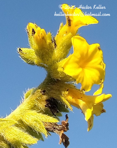 Hierba perenne hasta de 60 cm de alto; tallo erecto, lignificado en la base, hirsuto a adpreso estrigoso. Hojas alternas, sésiles a brevemente pecioladas, pecíolos de 0,5-2 mm de largo; láminas oblongas o elíptico angostas u ovadas, de 5-35 × 1-6 mm, cartáceas, hirsutas a adpreso estrigosas, ápice agudo, base aguda u obtusa, el margen revoluto. Inflorescencias en cincinos sésiles, hasta de 30 cm de largo, multifloros (ca. 70 flores); brácteas florales lineares o elíptico angostas, pequeñas. Flores subsésiles; cáliz de 3,5 mm de largo, lacinias agudas, hirsutas; corola hipocrateriforme, generalmente amarilla, tubo de 6-10 mm de largo, piloso en el exterior e interior, lóbulos 5, triangulares; estambres con anteras subuladas, ca. 1 mm de largo; gineceo ca. 1,5-2 mm de largo. Fruto globoso, ca. 2 × 3 mm, exocarpo verrugoso.
