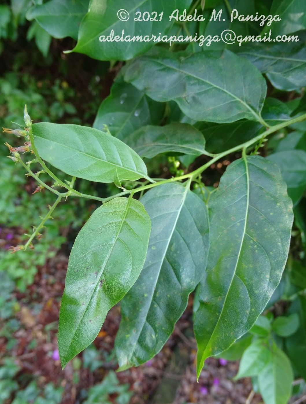 A´rboles o arbustos escandentes, de 1-3(-4) m de alto. Hojas alternas o subopuestas, con pecíolos de 0,6-1 cm de largo; láminas ovadas o elípticas, de 2-7 × 3-8 cm, cartáceas, adpreso estrigosas con tricomas de base pustulada en la cara adaxial y estrigosas, de densidad variable, a excepcionalmente subglabras en la cara abaxial, ápice agudo, ligeramente caudado, base obtusa o redondeada, margen entero. Inflorescencias en cincinos ramificados, pedunculados, terminales, multifloros (30-40 flores), de 5 cm de largo. Flores con cáliz densamente viloso, de 2 mm de largo, lacinias lineares, agudas; corola hipocrateriforme, con tubo de 4-5 mm de largo, viloso, lóbulos lineares agudos. Fruto de 2,5 × 2,5 mm, anaranjado o rojizo.