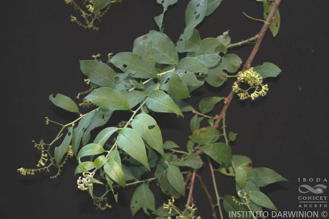 A´rboles o arbustos escandentes, de 0,5-3 m de alto. Hojas alternas o subopuestas, con pecíolos de 0,6-1 cm de largo; láminas ovadas o elípticas, de 1,2-4(-7) × 2,5-8(-10) cm, cartáceas, adpreso estrigosas de densidad variable en ambas caras, más densa en las porciones juveniles, excepcionalmente subglabras, ápice agudo, ligeramente caudado, base obtusa o redondeada, margen entero. Inflorescencias en cincinos ramificados, pedunculados, terminales, multifloros (30-40 flores), de 5 cm de largo. Flores con cáliz densamente viloso de 2 mm de largo, lacinias triangulares, agudas; corola hipocrateriforme, con tubo de 5-7 mm de largo, viloso, lóbulos agudos. Fruto de 2 × 4 mm, anaranjado o rojizo. Var. paniculatus.- Cara abaxial ligeramente estrigosa, principalmente sobre la nervaduras, a subglabra.