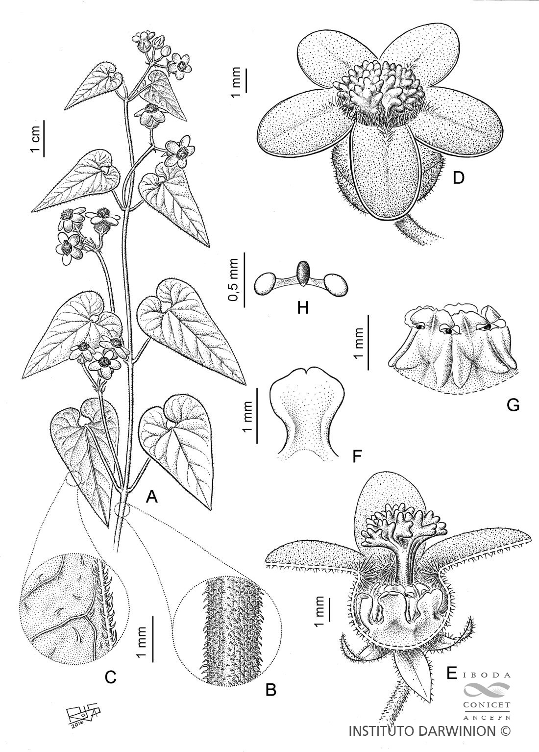 A. Rama florífera. B. Pubescencia del tallo. C. Pubescencia del hipofilo. D. Flor. E. Flor cortada mostrándola corona. F. Lóbulo de la corona. G. Ginostegio. H. Polinario.