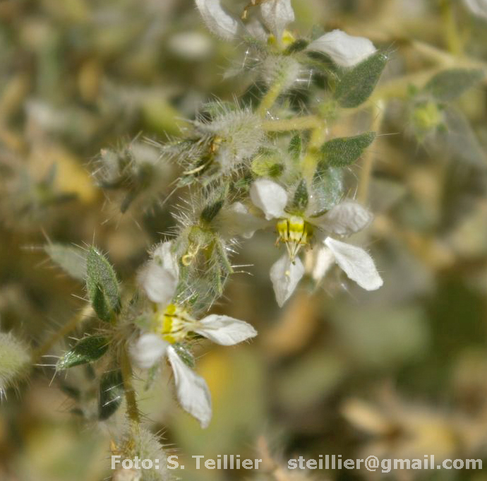 Hierbas anuales o subperennes, hasta de 30 cm de alto, profusamente ramificadas desde la base, ocasionalmente hierbas efímeras de 5-15 cm de alto, poco ramificadas; indumento de tricomas urticantes, gloquidiados y escabrosos, hojas y tallos jóvenes con tricomas glandulares, estos ocasionalmente ausentes; sistema radical con una raíz principal bien desarrollada pero delgada y poco ramificada. Hojas alternas (excepto las más basales), con pecíolos hasta de 45 mm de largo; láminas ovadas, de 12-65 × 5-47 mm, con el margen subentero, dentado, aserrado o irregularmente lobado, base atenuada, ápice de la lámina y los lóbulos, agudos. Inflorescencias en dicasios frondosos corimbiformes; flores pediceladas, horizontales a erguidas; brácteas 2 por flor (la recaulescencia y concaulescencia limitada dificultan apreciarlo), ovadas o elípticas, de 3-25 × 1-15 mm, semejantes a las hojas del follaje, disminuyendo progresivamente de tamaño hacia el ápice (donde pueden ser diminutas); pedicelos de 3-20 mm de largo, pero con elongación post-antética hasta de 40 mm de largo. Flores con cáliz 5-lobado, con los lóbulos, estrechamente lanceolados a lineares, de 2-6 × 0.5-1 mm; pétalos 5, cimbiformes, de 4-7 mm de largo, conspicuamente unguiculados, horizontales, la superficie adaxial glabra, superficie abaxial con tricomas gloquidiados, escabrosos y unos pocos urticantes, blancos; escamas nectaríferas cinco, amarillas o verdosas, cóncavas, con la base abultada, sacos de néctar indistintos, ápice con reborde y alas apicales conspicuas, mitad superior del dorso con tres filamentos dorsales claviformes, ca. 0,5 mm de largo, que apenas alcanzan el ápice de la escama; estaminodios papilosos, 2 por escama, hasta de 6 mm de largo, el cuarto basal aplanado y cóncavo, expandido en un “codo” apicalmente, tras el cual los 3/4 restantes del estaminodio son filiformes; estambres hasta ca. 90, filamentos hasta de 4 mm de largo, anteras crema; ovario ínfero, con indumento denso en su superficie externa, placentas tres; estilo hasta 4 mm de largo, con tres lóbulos estigmáticos. Frutos cápsulas cilíndricas a estrechamente obovoides, de 5-15 × 3-6 mm, dehiscentes por 3 valvas apicales (raras veces 5). Semillas castaño oscuras, ca. 30-50 por cápsula, de 2-3 × 1-1.5 mm, con 6-9 constricciones conspicuas, perpendiculares al eje principal; superficie irregularmente reticulada, con textura ondulada.