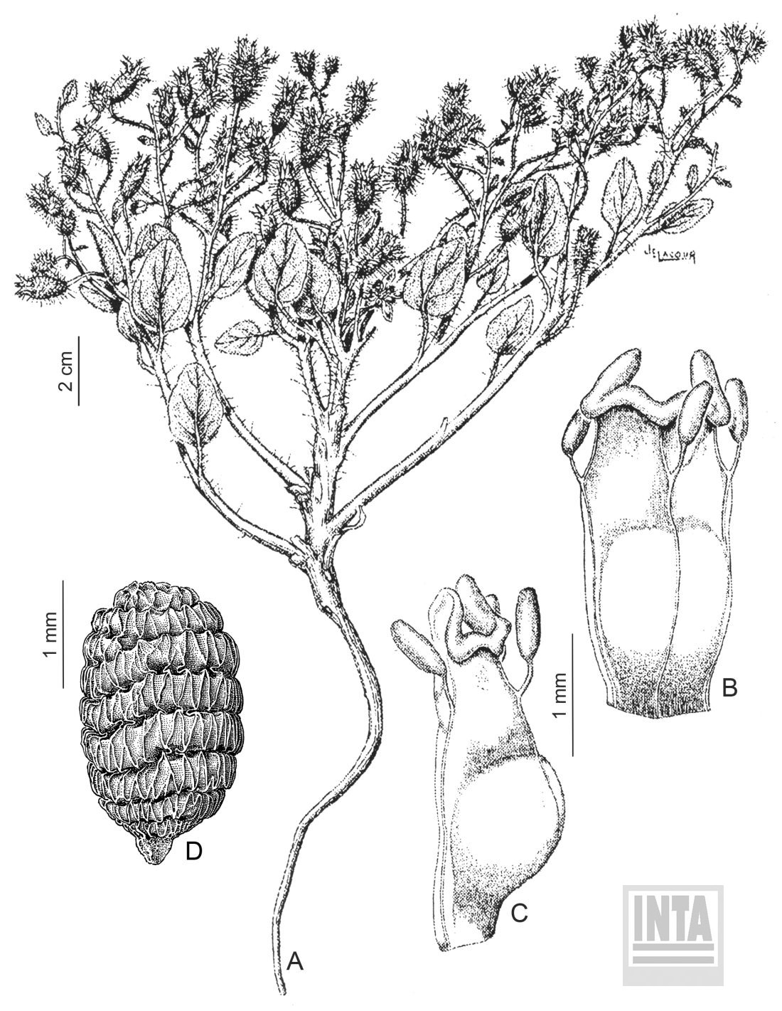 A. Planta con flores y frutos. B-C. Escama nectarífera. D. Semilla. A-C, tomados de Bol. Soc. Argent. Bot. 27: 134, fig. 1. 1991 (sub Loasa malesherbioides).
