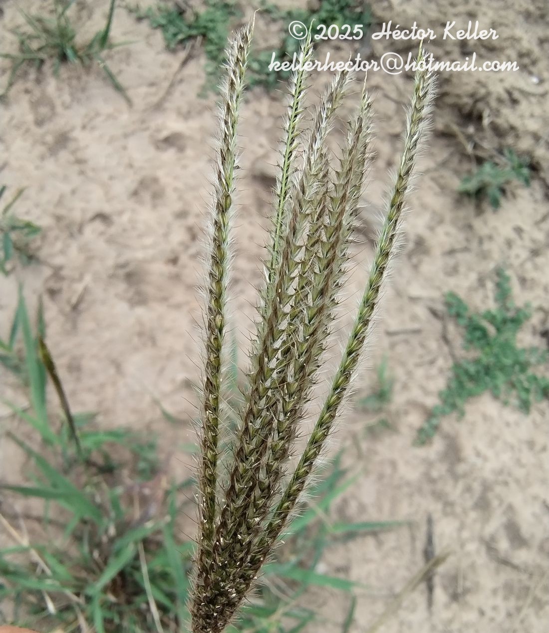 Hierbas perennes de 50-150 cm de alto, cespitosas, poco macolladas; cañas ramificadas, erectas o geniculadas en los nudos inferiores, robustas, subleñosas, hasta de 5 mm de diámetro, cilíndricas, glabras, plurinodes; nudos poco constreñidos, oscuros, glabros; vainas redondeadas, estriadas, verdosas, glabras o escabrosas, con pelos largos de base tuberculada en los márgenes inmediatamente por debajo de la lígula, las basales más cortas que los entrenudos y con láminas muy reducidas; lígulas brevísimas, membranáceo-pestañosas; láminas de 10-30 cm x 5-12 mm, lineares, planas, glabras, escabrosas o con pelos largos de base tuberculada en la cara adaxial cerca de la lígula, márgenes escabrosos. Inflorescencia obcónica, formada por 7-20 racimos espiciformes de 7-20 cm de largo, erectos, verticilados sobre un eje abreviado, pajizos a rosado-violáceos; raquis triquetro, escabroso, exerta o subincluido en la última hoja, ésta más desarrollada que las restantes. Espiguillas densamente imbricadas, tardíamente caedizas, brevemente pediceladas, pedicelo de 0,5-1 mm de largo, con 2-4 antecios inferiores perfectos, fértiles y 1-3 superiores neutros y estériles, reducidos gradualmente hacia el ápice, el último está representado por una arístula; raquilla articulada arriba de las glumas, escabriúscula, el primer artejo de 0,6 mm de largo, el segundo de 1 mm de largo; glumas 2, muy desiguales, igualando al antecio inferior o apenas menor, membranáceas, hialinas, glabras, 1-nervias, nervios escabrosos, cuerpo de la gluma inferior linear, de 1-1,5(-2,5-3,2) mm de largo, con una arístula de 1-2,5(-3) mm de largo, la superior de 2-3(-3,5) mm de largo, con una arista de 2-3 mm de largo; lemma del antecio fructífero de 3-4 mm de largo, lanceolada a linear-lanceolada, más o menos cartácea, dorso glabro, escepcionalmente pubérulo, márgenes ciliados, 3-nervia, 3-aristada, la arista central de (5,5-)6-20 mm de largo, las laterales de (0,7-2-)3-6,5 mm de largo, rectas, escabrosas; pálea de 4 mm de largo, apenas supera la longitud del cuerpo de la lemma, más o menos cartácea, biaquillada, carinas escabrosas, dorso plano, márgenes muy angostos y hialinos, biaristulada, arístula de 1,2-3 mm de largo, escabrosas, escepcionalmente bimucronadas; callo abundantemente piloso; lodículas 2, de 0,6 mm de largo, soldadas a la pálea; estambres 2, anteras de 0,4-0,8 mm de largo; cariopsis ca. 2,5 mm de largo, color castaño brillante, surco ventral ancho; mácula embrional menor que la ½ de la longitud del fruto; hilo basal punctiforme; endosperma seco.
