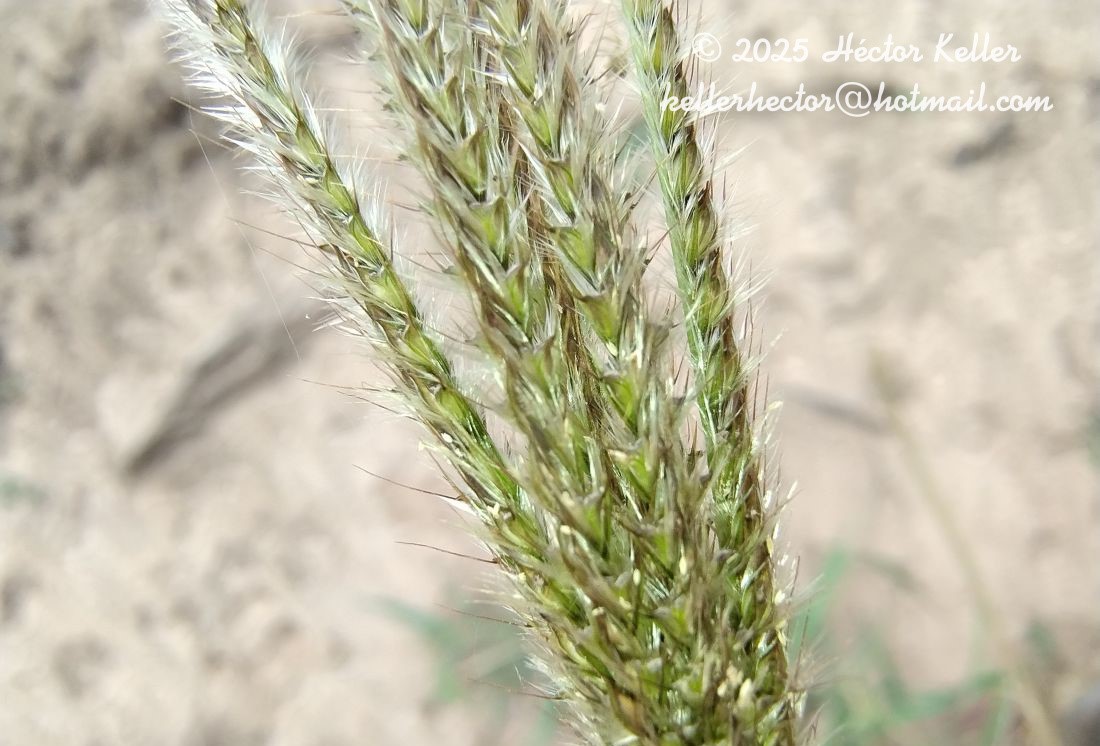 Hierbas perennes de 50-150 cm de alto, cespitosas, poco macolladas; cañas ramificadas, erectas o geniculadas en los nudos inferiores, robustas, subleñosas, hasta de 5 mm de diámetro, cilíndricas, glabras, plurinodes; nudos poco constreñidos, oscuros, glabros; vainas redondeadas, estriadas, verdosas, glabras o escabrosas, con pelos largos de base tuberculada en los márgenes inmediatamente por debajo de la lígula, las basales más cortas que los entrenudos y con láminas muy reducidas; lígulas brevísimas, membranáceo-pestañosas; láminas de 10-30 cm x 5-12 mm, lineares, planas, glabras, escabrosas o con pelos largos de base tuberculada en la cara adaxial cerca de la lígula, márgenes escabrosos. Inflorescencia obcónica, formada por 7-20 racimos espiciformes de 7-20 cm de largo, erectos, verticilados sobre un eje abreviado, pajizos a rosado-violáceos; raquis triquetro, escabroso, exerta o subincluido en la última hoja, ésta más desarrollada que las restantes. Espiguillas densamente imbricadas, tardíamente caedizas, brevemente pediceladas, pedicelo de 0,5-1 mm de largo, con 2-4 antecios inferiores perfectos, fértiles y 1-3 superiores neutros y estériles, reducidos gradualmente hacia el ápice, el último está representado por una arístula; raquilla articulada arriba de las glumas, escabriúscula, el primer artejo de 0,6 mm de largo, el segundo de 1 mm de largo; glumas 2, muy desiguales, igualando al antecio inferior o apenas menor, membranáceas, hialinas, glabras, 1-nervias, nervios escabrosos, cuerpo de la gluma inferior linear, de 1-1,5(-2,5-3,2) mm de largo, con una arístula de 1-2,5(-3) mm de largo, la superior de 2-3(-3,5) mm de largo, con una arista de 2-3 mm de largo; lemma del antecio fructífero de 3-4 mm de largo, lanceolada a linear-lanceolada, más o menos cartácea, dorso glabro, escepcionalmente pubérulo, márgenes ciliados, 3-nervia, 3-aristada, la arista central de (5,5-)6-20 mm de largo, las laterales de (0,7-2-)3-6,5 mm de largo, rectas, escabrosas; pálea de 4 mm de largo, apenas supera la longitud del cuerpo de la lemma, más o menos cartácea, biaquillada, carinas escabrosas, dorso plano, márgenes muy angostos y hialinos, biaristulada, arístula de 1,2-3 mm de largo, escabrosas, escepcionalmente bimucronadas; callo abundantemente piloso; lodículas 2, de 0,6 mm de largo, soldadas a la pálea; estambres 2, anteras de 0,4-0,8 mm de largo; cariopsis ca. 2,5 mm de largo, color castaño brillante, surco ventral ancho; mácula embrional menor que la ½ de la longitud del fruto; hilo basal punctiforme; endosperma seco.