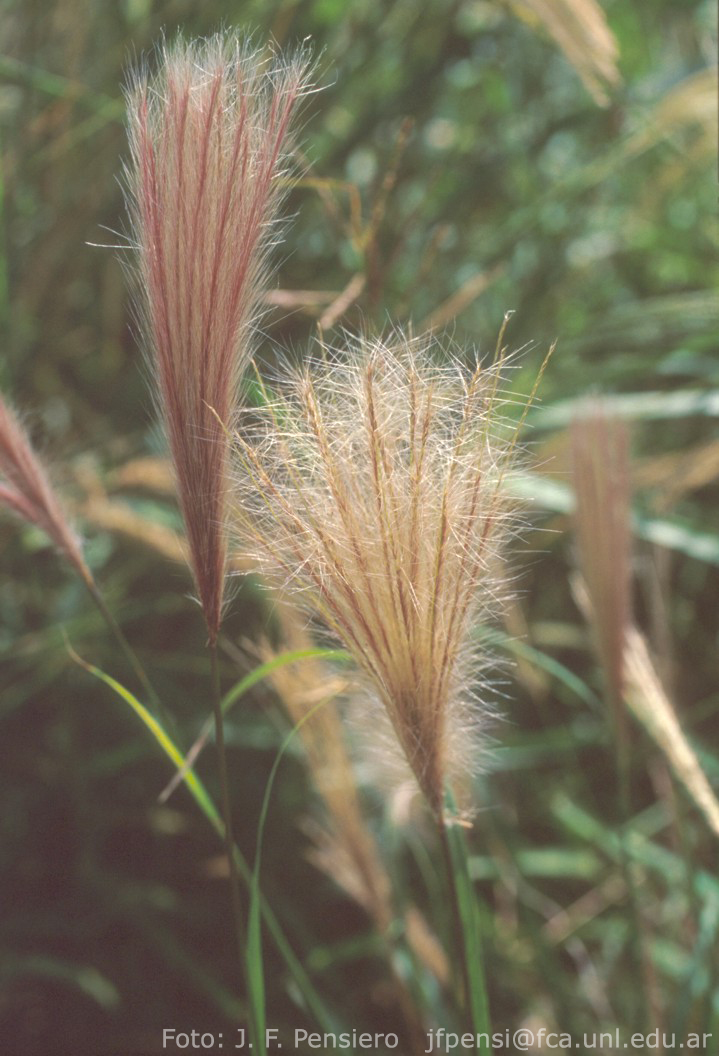 Hierbas perennes de 30-80(-100) cm de alto, cespitosas, con rizomas cortos o estoloníferas, estolones largos y endurecidos, macollas abundantes, matas más o menos densas; cañas simples, a veces ramificadas, erectas o geniculadas en los nudos inferiores, muy comprimidas, glabras, paucinodes; nudos constreñidos, oscuros, glabros; vainas aquilladas, amarillo-verdosas a violáceas, ferrugíneas al envejecer, estriadas, escabrosas, menores que los entrenudos, con abundantes pelos de 6 mm de largo, de base tuberculada, en los márgenes, cerca de la lígula, o en toda su superficie; lígulas brevísimas, membranáceo-pestañosas; láminas de 15-25 cm x 2-10 mm, conduplicadas o planas, escabrosas, con pelos largos de base tuberculada en ambas caras, muy abundantes cerca de la lígula donde forman mechones, márgenes escabrosos. Inflorescencia obcónica, exerta, a veces incluida en una vaina ensanchada, formada por 5-25 racimos espiciformes de 5-18 cm de largo, fasciculados en varios verticilos sobre un eje abreviado, rojo-violáceos al florecer, pajizos al madurar, raquis triquetro, escabroso. Espiguillas densamente imbricadas, muy caedizas, brevemente pediceladas, pedicelo de 1,5 mm de largo, escabriúsculo a glabro, con 1 antecio inferior perfecto, fértil y 1-2 superiores, neutros, estériles, sostenidos por una raquilla escabriúscula ca. 2 mm de largo; antecio estéril con lemma de cuerpo muy reducido, 3-aristada, aristas de 10-21 mm de largo, iguales o más o menos iguales en longitud que las aristas de la lemma del antecio fértil, generalmente poco menores; el segundo antecio estéril, cuando presente, representado por 1, 2 ó 3 arístulas débiles de 1-7 mm de largo o por una lemma diminuta sostenida por un corto pedicelo, con 3 aristas débiles de menor longitud; raquilla articulada por arriba de las glumas, escabriúscula, ca. 2 mm de largo; glumas 2, muy desiguales, menores que el antecio, membranáceas, hialinas, lineares a lanceoladas, glabras, 1-nervias, nervio escabroso, cuerpo de la gluma inferior de 0,5-2 mm de largo, mucronada o con arístula de 1 mm de largo, la superior de 2,5-3,5 mm de largo, con arístula ca. 2 mm de largo; lemma del antecio fértil de 2,5-3,5 mm de largo, estrechamente lanceolada a elíptica, más o menos cartácea, muy pubescente en todo su contorno, 3-nervia, 3-aristada, la arista central de 10¬-30 mm de largo, las laterales iguales o poco menores que la central, rectas, escabrosas; pálea de igual longitud que la lemma o apenas menor, más o menos cartácea, biaquillada, brevemente bidentada, ½ superior de las carinas escabriúscula, dorso plano, escabriúsculo, márgenes angostos, membranáceo-hialinos; callo abundantemente piloso; lodículas 2, de 0,6 mm de largo, soldadas a la pálea; estambres 2, anteras de 0,6 mm de largo, exertas o adheridas al ápice del cariopsis; cariopsis de 1,7-2,4 mm de largo, fusiforme, translúcida, surco longitudinal profundo; mácula embrional ½ de la longitud del fruto; hilo basal punctiforme; endosperma seco.