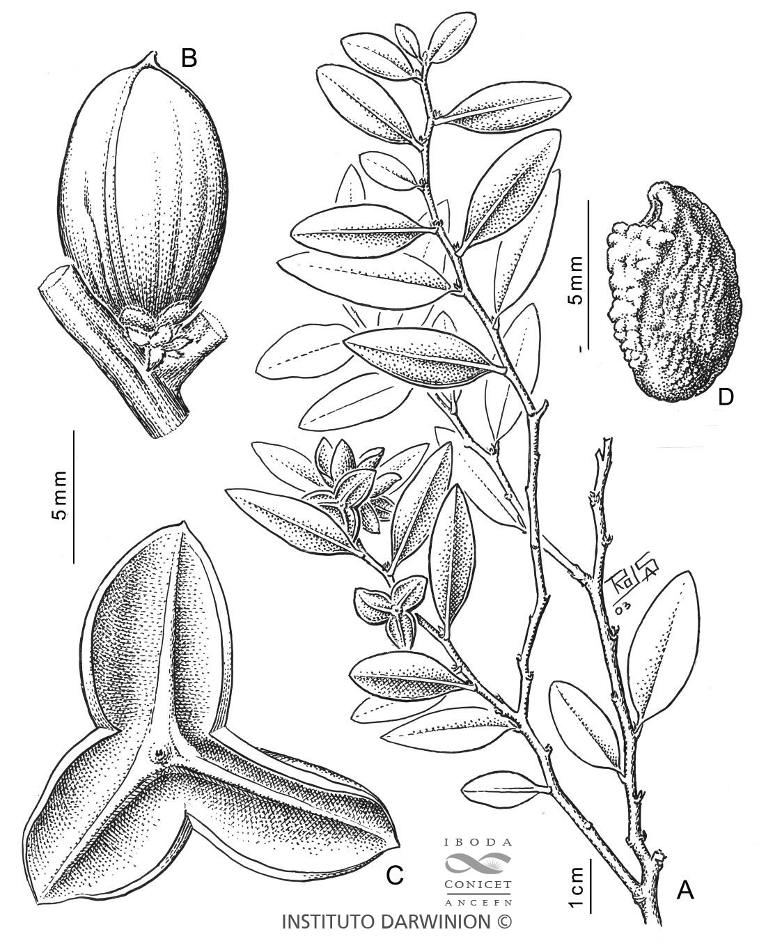 A. Rama fructífera. B. Fruto. C. Fruto dehiscente (las semillas han caído). D. Semilla.