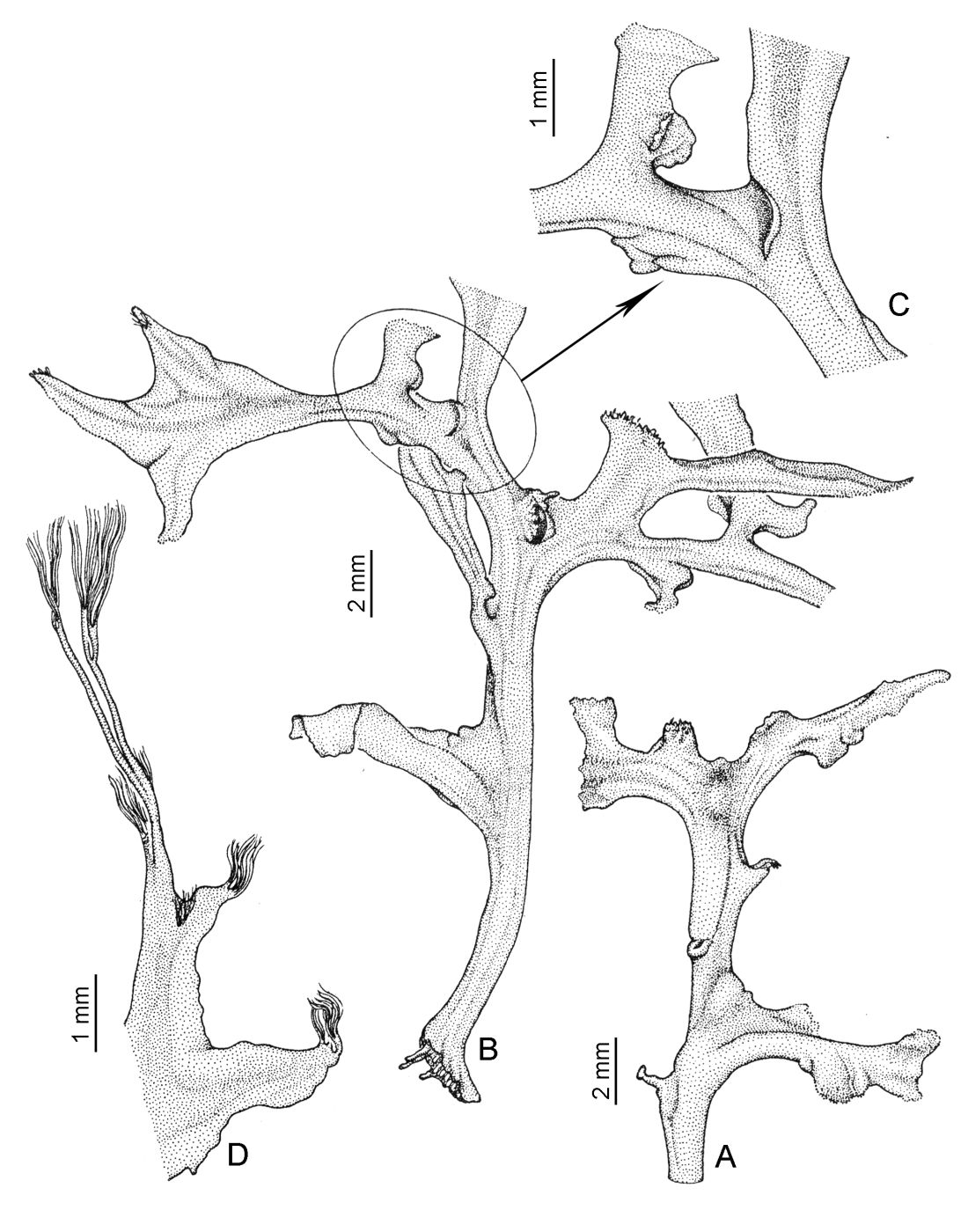 A. Porción de tallo mostrando el botón floral oculto. B-C. Planta estéril. D. Hoja. Tomado de Aquatic Bot. 57: 219, fig. 3. 1997.