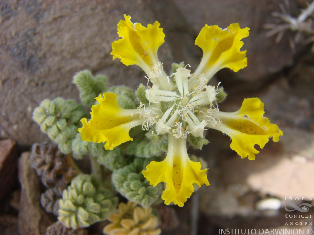 Planta cespitosa hasta de 20 cm de alto, con pubescencia densa, tricomas escabrosos de base ensanchada y tricomas gloquidiados; tallos numerosos, pubescentes, postrados o algo ascendentes. Hojas opuestas, pubescentes; pecíolos de 7-45 mm de largo, algo amplexicaules; láminas ovadas, de 5-23 × 3-9 mm, pinnatisectas, con las pinnas tan próximas que parecen superpuestas, tricomas escabrosos antrorsos. Inflorescencias monocasios paucifloros que a veces parecen flores solitarias, con menos frecuencia en dicasios. Flores 5-meras; cáliz con segmentos subovados o subelípticos, de 3-6,5 × 1,5-2,5 mm, algo patentes, pubescentes; pétalos anchamente espatulados, de 8-12 × 7-10 mm y 2,5-4 mm de profundidad, muy cóncavos, irregularmente laciniados, muy crespos, distalmente amarillos, basalmente blancos o amarillos, exteriormente pubescentes; escamas nectariferas subrectangulares, de 3,5-6 mm de largo, blancas, contrastando con el color de los pétalos, muy cóncavas, curvas en perfil, con 4 lóbulos en la parte superior, los 2 centrales mayores y a veces emarginados, en el dorso debajo de los lóbulos, 3 pequeñas quillas aladas, que se extienden ligeramente debajo de la inserción de sendos apéndices filiformes; apéndices dorsales insertos en la base del tercio superior de la escama de 2-3 mm de largo, algo expandidos en su parte terminal; estaminodios 2 por escama nectarífera, de 5-7 mm de largo, en forma de “L”, doblados un poco debajo de la mitad, parte inferior subrectangular, pubescente, la superior subfusiforme, papilosa y con una prolongación abruptamente adelgazada, filiforme, por encima de la punta de la escama; estambres en fascículos de 13-17; filamentos de 5-7 mm de largo; anteras elipsoides, ca. 0,5 mm de largo; ovario anchamente obcónico, ca. 1,5 mm de largo × 5 mm de diámetro en la parte superior, pubescente, placentas 3, óvulos numerosos; estilo de 2-4 mm de largo, pubescente en los dos tercios inferiores, 3-fido. Frutos cápsulas obcónicas, de 6-11 mm de largo × 7-10 mm de diámetro en la parte superior, pubescentes, dehiscentes por 3 valvas. Semillas 70-170, de 1,8-2,5 mm de largo, de formas irregulares, aunque más o menos elipsoides u obovoides, reticuladas, castaño oscuras.