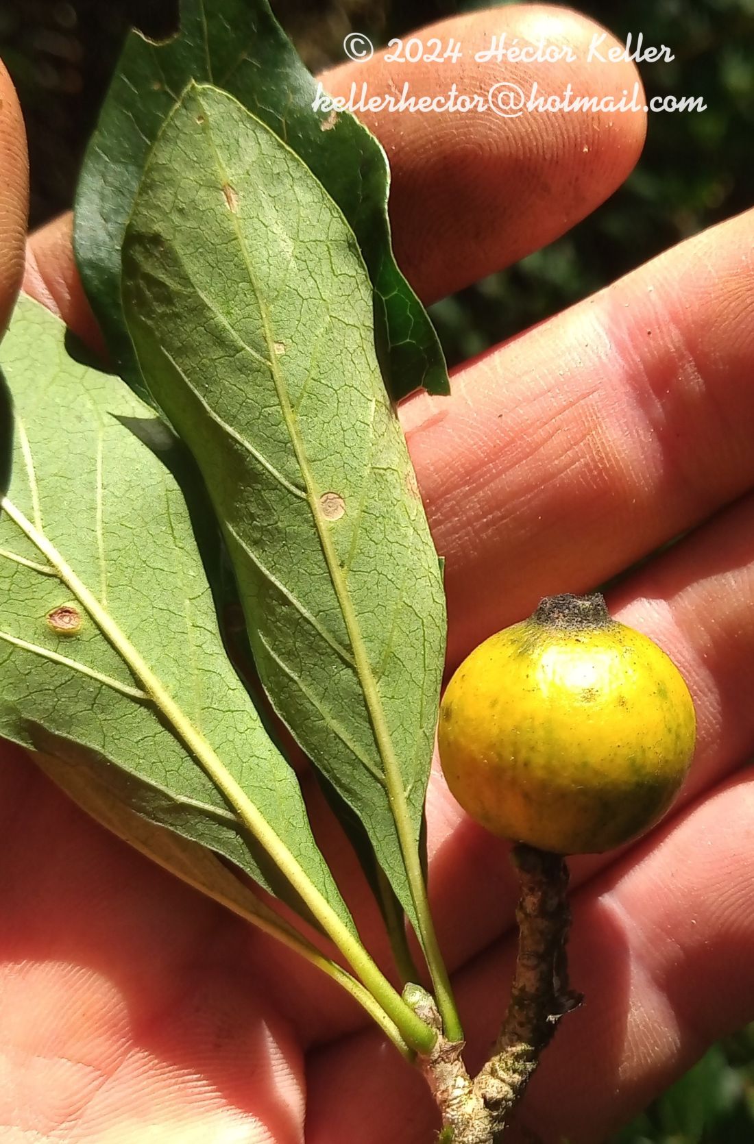 Árbol o arbolito, de 3-7,4 m de alto; tronco de 19 cm de diámetro en la base; ramas opuestas; espinas 3-4 por nudo, de 5,6-14,8 × 0,78-2,5 mm; braquiblastos 1-2 en el ápice. Hojas con láminas anchamente ovadas, de 32-78 × 18,1-48 mm, de base atenuada, ápice cuspidado, cortamente acuminado o raramente mucronado, glabras en ambas caras; 5-9 venas secundarias a ambos lados, ascendentes, pubérulas; domacios en mechón de pelos entre la vena primaria y las venas secundarias; estípulas triangulares u ovadas, de 2,2-5,54 mm de largo, el ápice agudo o acuminado, externamente glabras, internamente con coléteres y tricomas simples distribuidos en la base de la estípula, verdes, caducas; pecíolo de 3,1-17,2 mm de largo, glabro. Inflorescencia estaminada terminal, fasciculada, 3-8 flora. Flores estaminadas 5-meras, fragrantes; pedicelo de 3,4-9,2 mm de largo; cáliz con 5 lóbulos triangulares o espatulados, de 1,8-3,9 mm de largo, iguales o desiguales, externamente glabros e internamente pubescentes, margen glabro o pubérulo; corola hipocrateriforme con tubo de 2,8-7,9 × 2-3,2 mm, externamente glabro e internamente pubescente desde la mitad del tubo hasta la base de los lóbulos, verde; lóbulos obovados, de 2,5-6,5 mm de largo, ápice redondeado, al comienzo de la antesis patentes y blancos, tornándose amarillos o inflexos al final; ovario obcónico, pubérulo y reducido; pistilodio exerto; estigma 2-fido, lóbulos ovados, lisos; disco nectarífero epígino; estambres parcialmente exertos; anteras sésiles, de 1,5-1,6 mm de largo. Inflorescencia pistilada 1-flora, terminal. Flores pistiladas con pedicelo de 2,8-3 mm de largo; cáliz con 5 lóbulos espatulados, elípticos, angostamente obovados o angostamente triangulares, de 4,2-8,8 mm de largo, desiguales en forma y tamaño, variadamente foliáceos, de ápice mucronado o acuminado, externamente glabros e internamente pubescentes, ciliados; corola hipocrateriforme, con tubo de 4,7-5,4 × 3,3-3,5 mm, externamente glabro, internamente pubescente desde la mitad del tubo hasta la base de los lóbulos, verdosa; lóbulos obovados, de 3,6-4,8 mm de largo, el ápice redondeado, blanquecinos y tornándose amarillentos al final de la antesis; estaminodio parcialmente exerto; ovario urceolado, de 7,1-7,9 mm de largo, pubérulo; estilo parcialmente exerto, glabro; estigma 2-fido, lóbulos estigmáticos ovados, papilosos; disco nectarífero epígino. Fruto una baya globosa, de 13,7-17,2 × 12,5-16 mm, pubérula, sésil o subsésil; pericarpo de 0,3-0,4 mm de espesor, coriáceo. Semillas de contorno obovado, de 2-4 mm de largo, achatadas, nigrescentes, inmersas en una pulpa gelatinosa.
