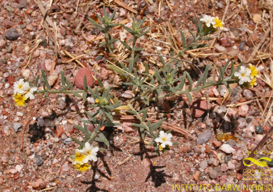 Hierba perenne hasta de 30 cm de alto; tallo rizomatoso, algo lignificado en la base, densamente adpreso estrigoso. Hojas alternas, sésiles o con pecíolos de 2-4 mm de largo; láminas lineares, de 10-30 × 1-4 mm, cartáceas, densamente adpreso estrigosas, ápice agudo, base aguda, el margen revoluto. Inflorescencias en cincinos sésiles, hasta de 3 cm de largo, paucifloros (ca. 10 flores); brácteas florales lineares, pequeñas. Flores sésiles o brevemente pediceladas; cáliz de 4,5-7 mm de largo, lacinias agudas, adpreso estrigosas o hirsutas; corola amarilla, rara vez blanca, hipocrateriforme, tubo de 9-11 mm de largo, el interior glabro, excepto la garganta pilosa, lóbulos 10, triangulares; estambres con anteras subuladas ca. 1 mm de largo; gineceo ca. 2 mm de largo. Fruto globoso, ca. 2 × 3 mm, exocarpo velloso.