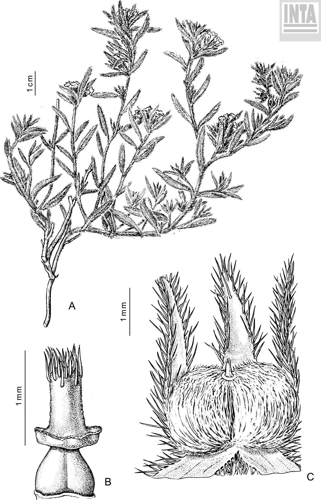 Hierba perenne hasta de 30 cm de alto; tallo rizomatoso, algo lignificado en la base, densamente adpreso estrigoso. Hojas alternas, sésiles o con pecíolos de 2-4 mm de largo; láminas lineares, de 10-30 × 1-4 mm, cartáceas, densamente adpreso estrigosas, ápice agudo, base aguda, el margen revoluto. Inflorescencias en cincinos sésiles, hasta de 3 cm de largo, paucifloros (ca. 10 flores); brácteas florales lineares, pequeñas. Flores sésiles o brevemente pediceladas; cáliz de 4,5-7 mm de largo, lacinias agudas, adpreso estrigosas o hirsutas; corola amarilla, rara vez blanca, hipocrateriforme, tubo de 9-11 mm de largo, el interior glabro, excepto la garganta pilosa, lóbulos 10, triangulares; estambres con anteras subuladas ca. 1 mm de largo; gineceo ca. 2 mm de largo. Fruto globoso, ca. 2 × 3 mm, exocarpo velloso.