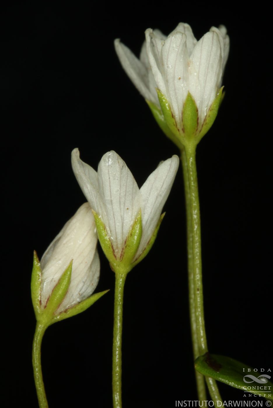 Hierba rastrera o erecta, con tallos filiformes, de 5-25 cm de largo, radicante en los nudos, glabra. Hojas opuestas, raramente subopuestas o en verticilos 3-meros, elípticas, ovadas, subcirculares u ovado-espatuladas, de 3-10(-12) × 2-7 mm, subsésiles o con un pecíolo de 1-4 mm de largo, de ápice agudo-mucronado u obtuso, base atenuada, cara abaxial con puntuaciones glandulares rojizas, margen revoluto, cartáceas, glabras. Flores solitarias, axilares; pedicelo filiforme, de 2-3 mm de largo; cáliz 5-partido, segmentos lanceolados, de 3-4,5 × 0,5-1 mm, margen hialino, de ápice agudo, con puntuaciones glandulares rojizas; corola 5-partida casi hasta la base, con los lóbulos elípticos, oblongos u oblanceolados, de 5-7 × 1,5-3 mm, blancos, de ápice truncado, obtuso o agudo, 2-dentado o eroso; estambres 5, filamentos de 4-5 mm de largo, tubo estaminal de 1,5-2 mm de largo, con glándulas punctiformes en la base y con tricomas hasta la mitad de la porción libre de los filamentos, anteras de contorno elipsoide, de 0,5-1 mm de largo; ovario globoso, de 1-1,5 mm de largo, glabro, estilo filiforme, de 3,5-5 mm de largo, estigma papiloso. Fruto una cápsula globosa, de 1,5-3 mm de diámetro, de dehiscencia circuncisa. Semillas numerosas, tetraédricas, verrucosas, negras.