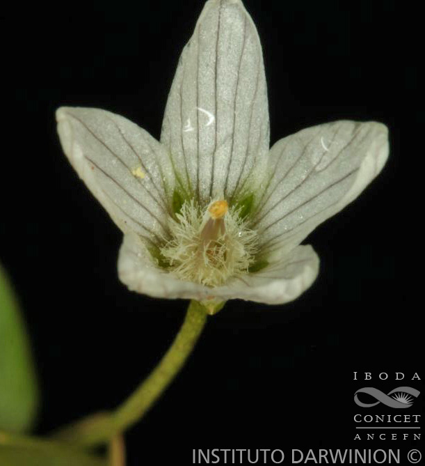 Hierba rastrera o erecta, con tallos filiformes, de 5-25 cm de largo, radicante en los nudos, glabra. Hojas opuestas, raramente subopuestas o en verticilos 3-meros, elípticas, ovadas, subcirculares u ovado-espatuladas, de 3-10(-12) × 2-7 mm, subsésiles o con un pecíolo de 1-4 mm de largo, de ápice agudo-mucronado u obtuso, base atenuada, cara abaxial con puntuaciones glandulares rojizas, margen revoluto, cartáceas, glabras. Flores solitarias, axilares; pedicelo filiforme, de 2-3 mm de largo; cáliz 5-partido, segmentos lanceolados, de 3-4,5 × 0,5-1 mm, margen hialino, de ápice agudo, con puntuaciones glandulares rojizas; corola 5-partida casi hasta la base, con los lóbulos elípticos, oblongos u oblanceolados, de 5-7 × 1,5-3 mm, blancos, de ápice truncado, obtuso o agudo, 2-dentado o eroso; estambres 5, filamentos de 4-5 mm de largo, tubo estaminal de 1,5-2 mm de largo, con glándulas punctiformes en la base y con tricomas hasta la mitad de la porción libre de los filamentos, anteras de contorno elipsoide, de 0,5-1 mm de largo; ovario globoso, de 1-1,5 mm de largo, glabro, estilo filiforme, de 3,5-5 mm de largo, estigma papiloso. Fruto una cápsula globosa, de 1,5-3 mm de diámetro, de dehiscencia circuncisa. Semillas numerosas, tetraédricas, verrucosas, negras.