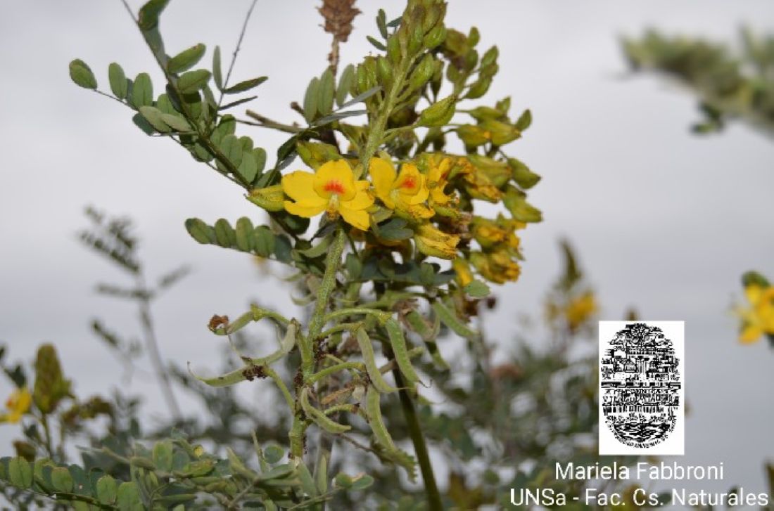 Arbustos 1,5-3 m alt. Hojas 12-18(-25) cm long.; estípulas ovadas 3 mm long., pubérulas, glandulosas; pinnas 3-5 pares; folíolos (4-)5-8 pares, elípticos a ovados (3,5-) 6-15 (-20) mm long. x (1,5-) 6-10 mm lat., pubescentes principalmente en el envés y generalmente con glándulas negras sésiles en el margen. Racimos terminales u opuestos a las hojas, 6-20 cm long.; flores 15-19 mm long; pedicelos pilosos y glandulosos 4-10 mm long.; cáliz de sépalos glandulosos, laciniados, 11 mm long. x 3 mm lat., el ventral mayor; corola de pétalos elíptico-obovados 15 mm long. x 7-10 mm lat.; androceo de estambres inclusos; ovario piloso, 6 mm long., 6-7-ovulado. Legumbre amarillenta, levemente falcada, finamente pubsecente, 6-8 cm long. x 1,5-2 cm lat., eglandulosa; 4-6–seminada.